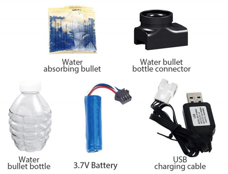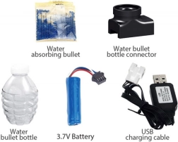 Pakuotėje rasite blasterį, dėtuvę, apsauginius akinius, įkraunamą bateriją ir USB kabelį. Užtenka sudrėkinti rutuliukus ir galite žaisti.