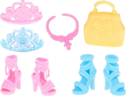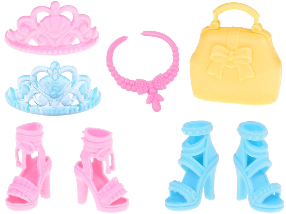 Dvi elegantiškos aukštakulnių poros suteikia bendram įvaizdžiui žavesio ir stiliaus. Aksesuarai, tokie kaip praktiška rankinė, rožinis vėrinys ir dvi karūnos, yra tobuli kiekvienai mažajai princesei.