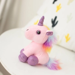 Šis žavus pliušinis vienaragis yra originalus aksesuaras kuprinei, rankinei, raktams ar penalui. Pagamintas iš malonaus rožinio pliušo su blizgančiomis violetinėmis detalėmis, turi minkštą karčius ir uodegą vaivorykštės spalvų bei spindintį ragą. Šis mini vienaragis sužavės ir vaikus, ir suaugusiuosius.