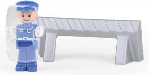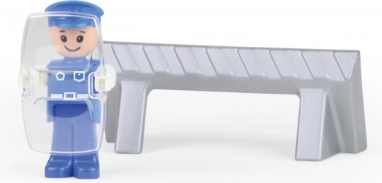 Į komplektą įeina aktyvi policininko figūrėlė su skydu ir kelio užtvara, leidžianti vaikams kurti savo policijos scenarijus ir mokytis padėti bei saugoti. Žaislas yra visiškai mechaninis – jokų baterijų, tik grynas smagumas.
