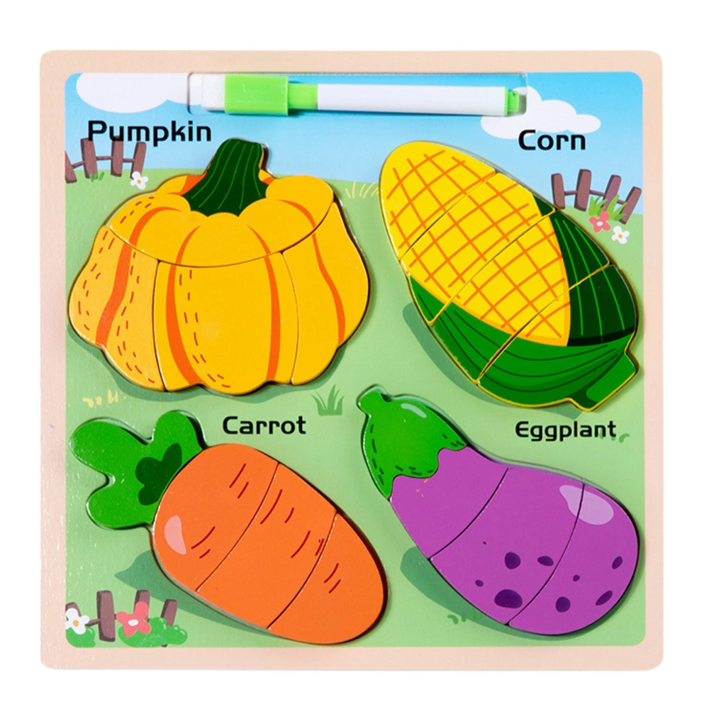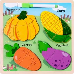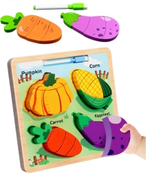 Ši medinė dėlionė suteikia vaikams puikią galimybę išmokti atpažinti formas ir lavinti smulkiąją motoriką. Rinkinyje yra keturios mėgstamos daržovės: moliūgas, kukurūzas, morka ir baklažanas. Kiekvienas elementas suskirstytas į mažesnes dalis, kurias vaikai dėlioja į atitinkamas vietas lentoje.