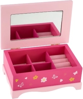 Ši rožinė medinė papuošalų dėžutė Princess derina kerintį vaizdą su praktišku išdėstymu. Dėl veidrodėlio vidinėje dangtelio pusėje ir penkių apgalvotų skyrelių papuošalai bei smulkmenos visada bus gražiai sutvarkyti. Subtili gėlių dekoracija ir užrašas Princess kuria pasakišką atmosferą, puikiai tinkančią vaikų kambariui.