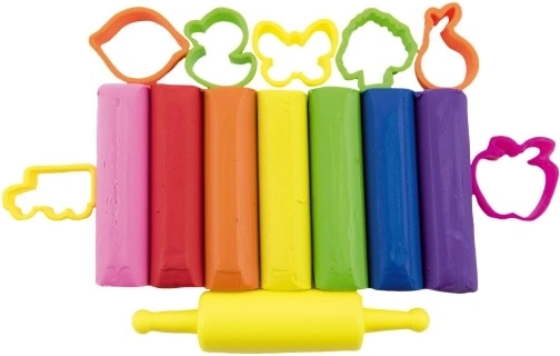 Rinkinyje yra įvairių spalvų plastilinas – rožinė, raudona, oranžinė, geltona, žalia, mėlyna ir violetinė.