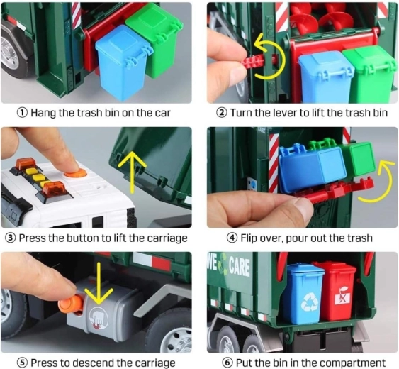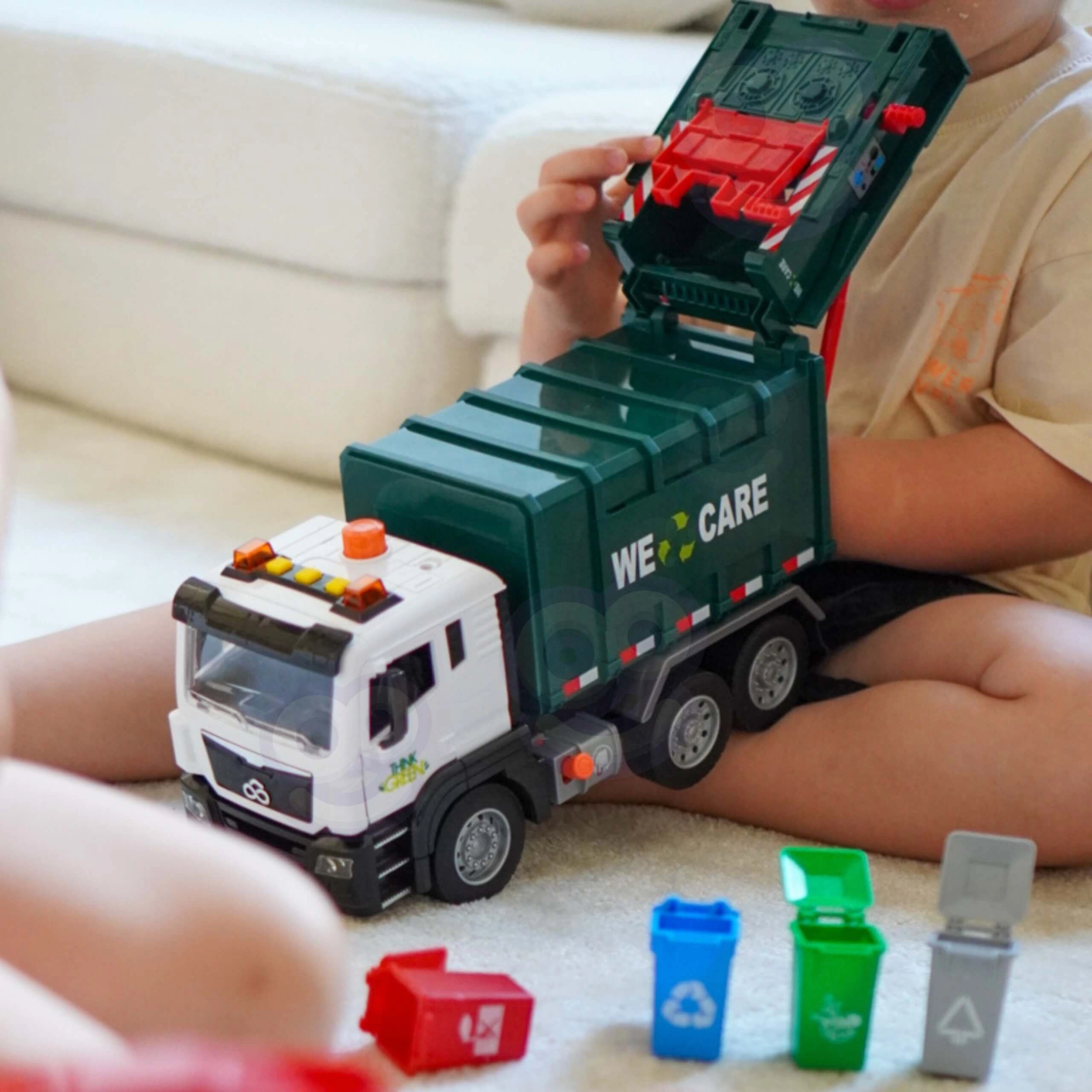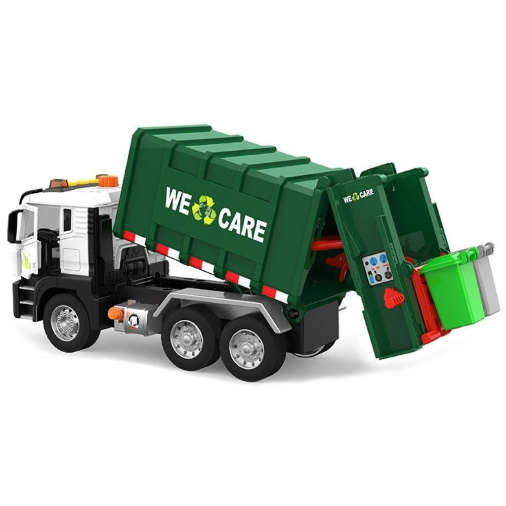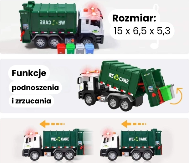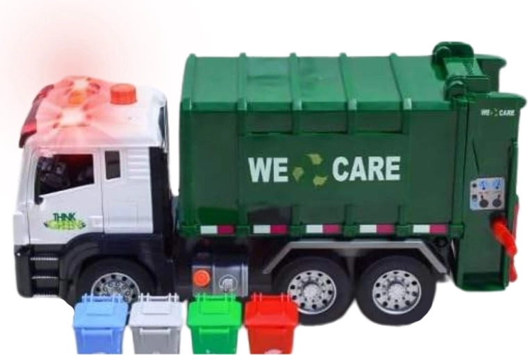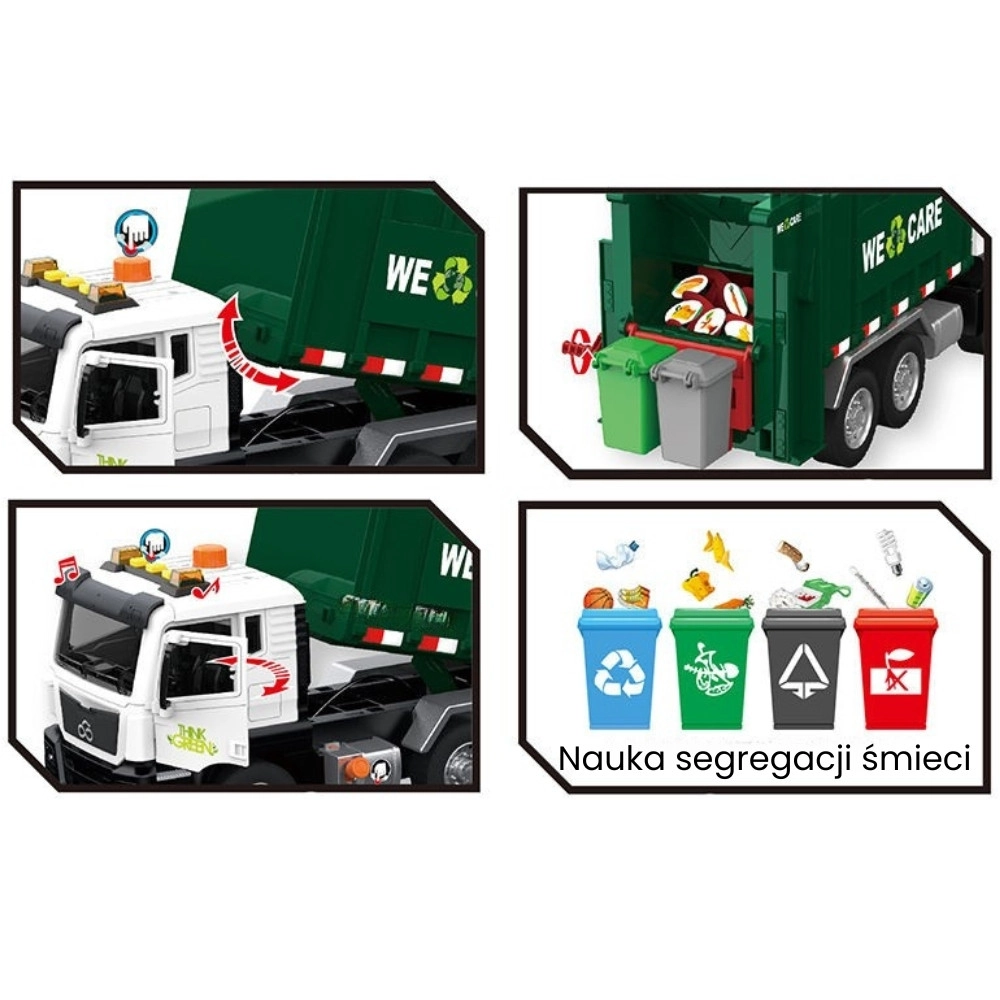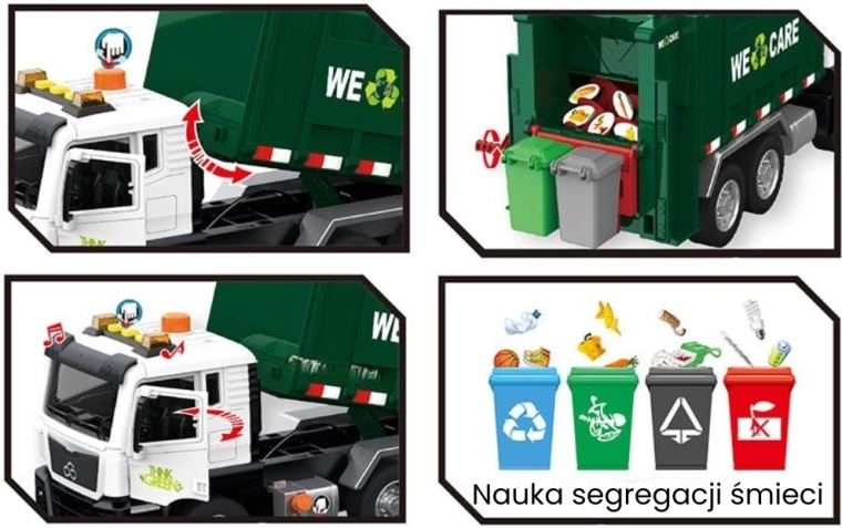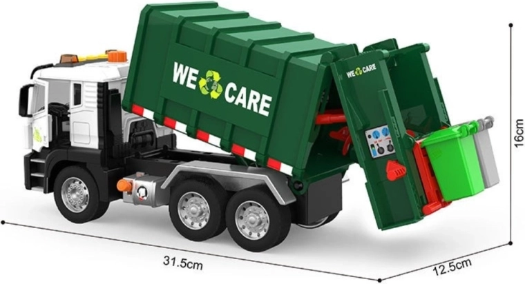 Šis detaliai sukurtas šiukšlių vežimas su užrašu „WE CARE“ suteikia vaikams autentišką atliekų surinkimo žaidimą. Dėka veikiančio kėlimo rankenies, atidaromo galinio dangčio ir pridėtų mini kibirėlių, vaikai išbandys realius rūšiavimo ir atliekų išvežimo veiksmus. Integruoti šviesos ir garso efektai didina žaismingumą ir skatina vaizduotę.