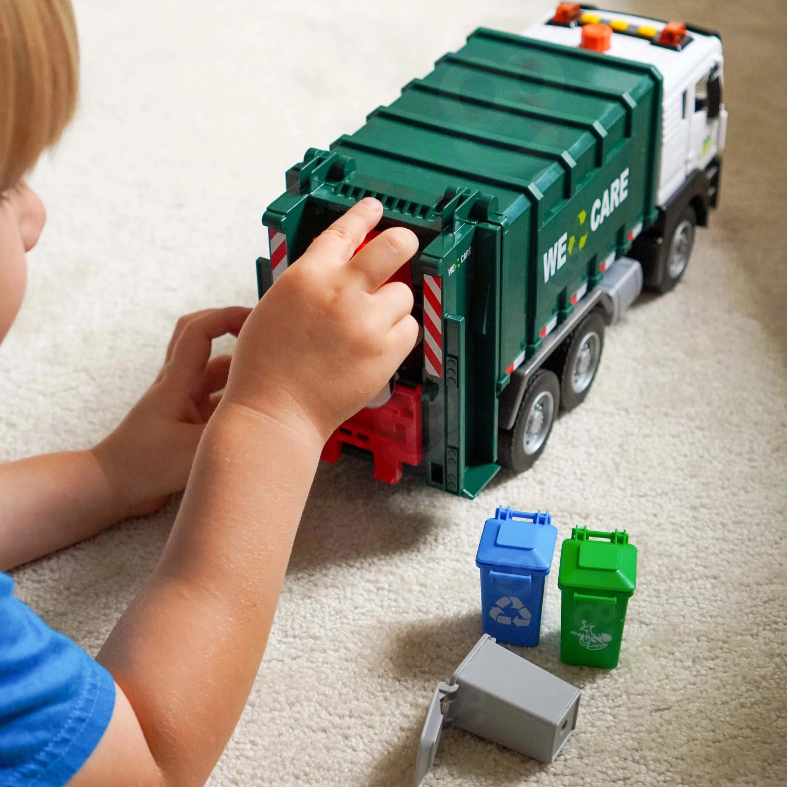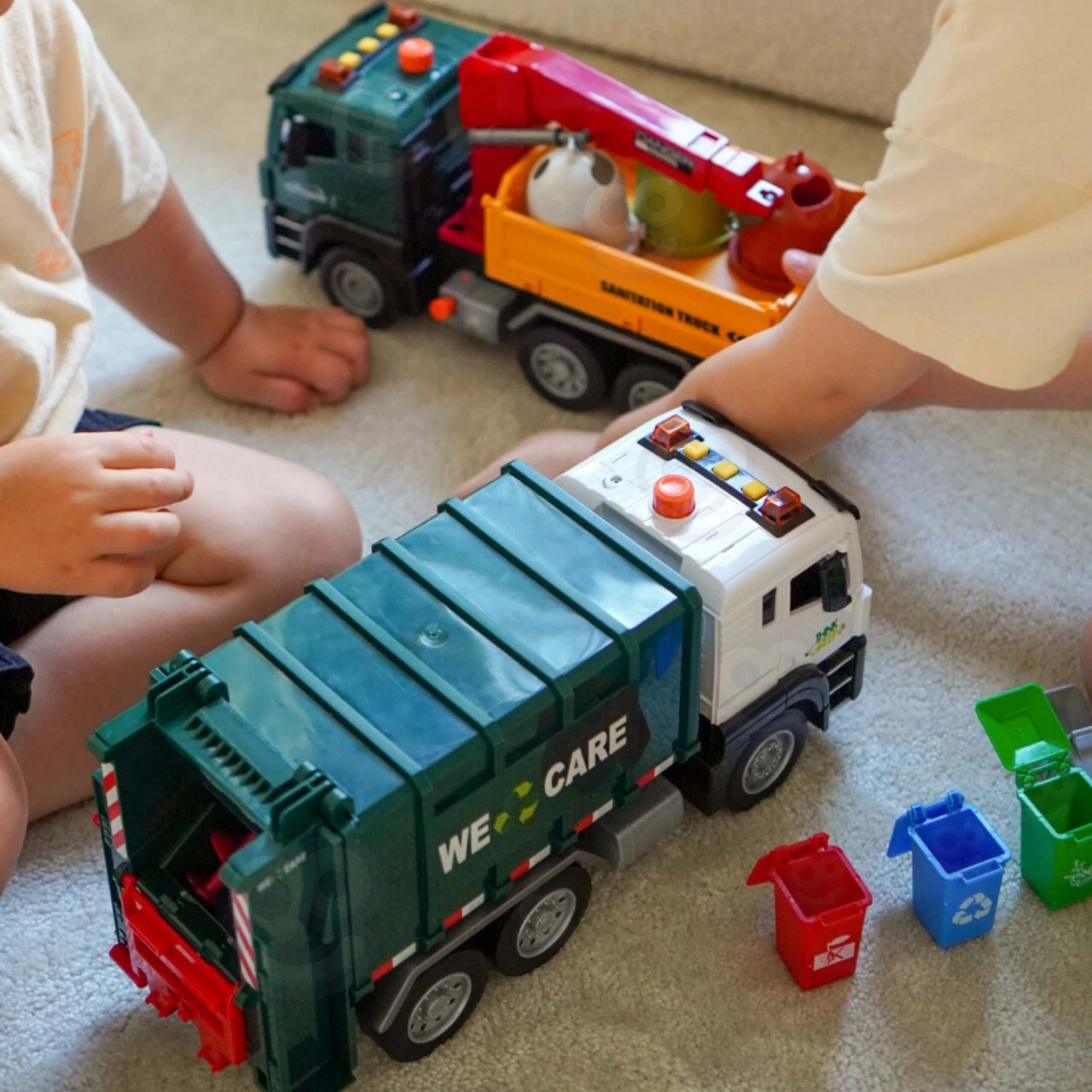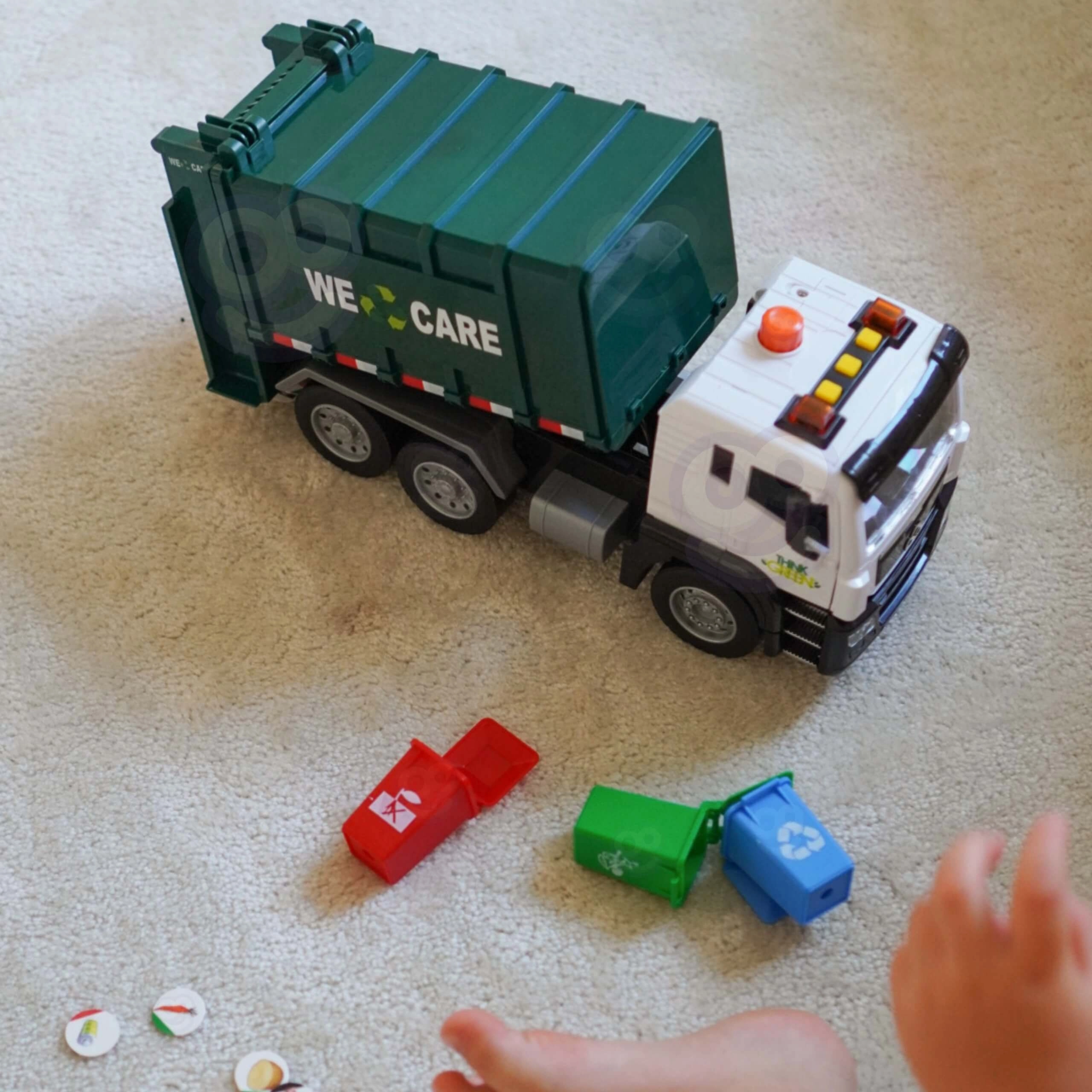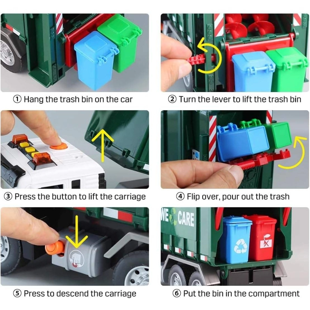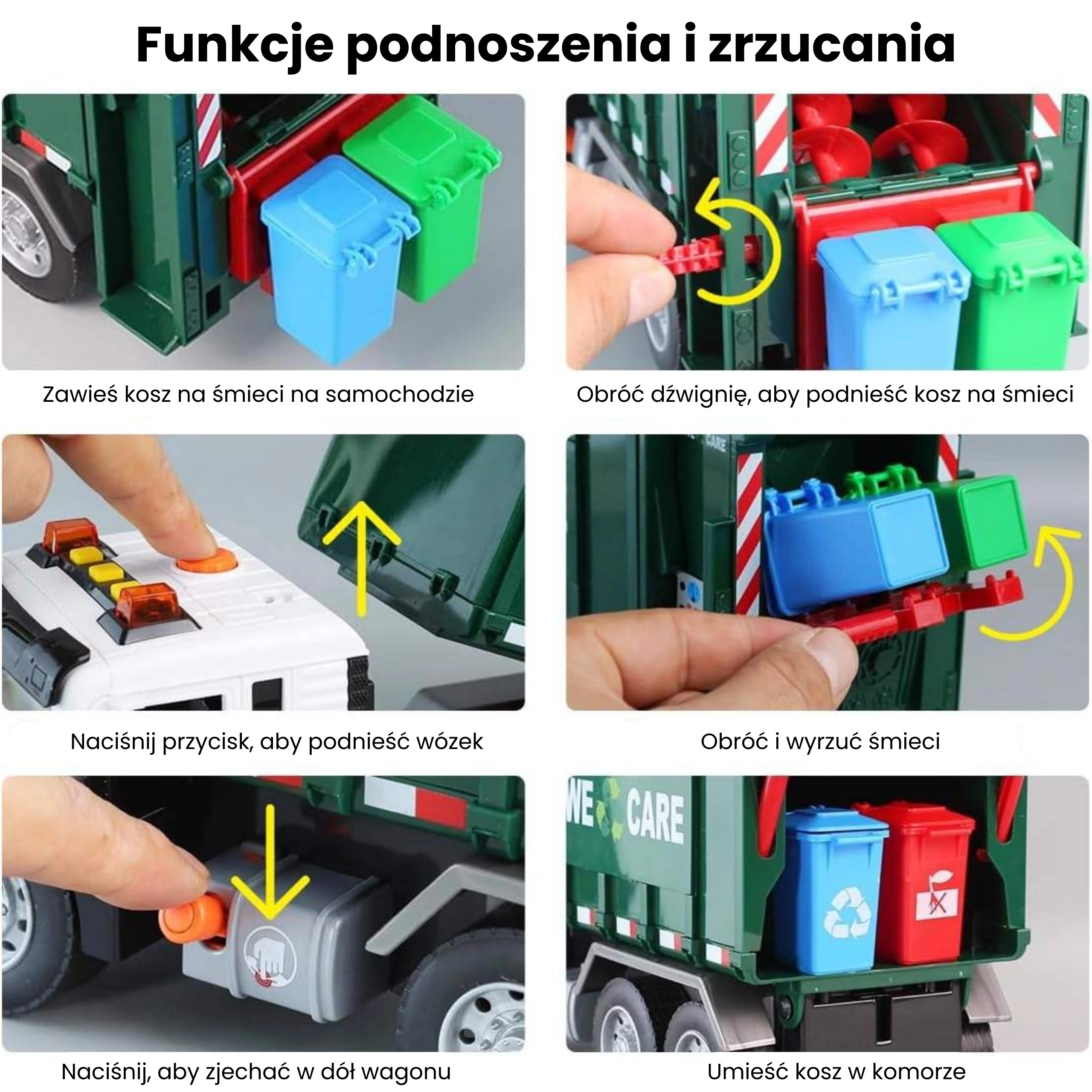 Šis detaliai sukurtas šiukšlių vežimas su užrašu „WE CARE“ suteikia vaikams autentišką atliekų surinkimo žaidimą. Dėka veikiančio kėlimo rankenies, atidaromo galinio dangčio ir pridėtų mini kibirėlių, vaikai išbandys realius rūšiavimo ir atliekų išvežimo veiksmus. Integruoti šviesos ir garso efektai didina žaismingumą ir skatina vaizduotę.