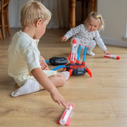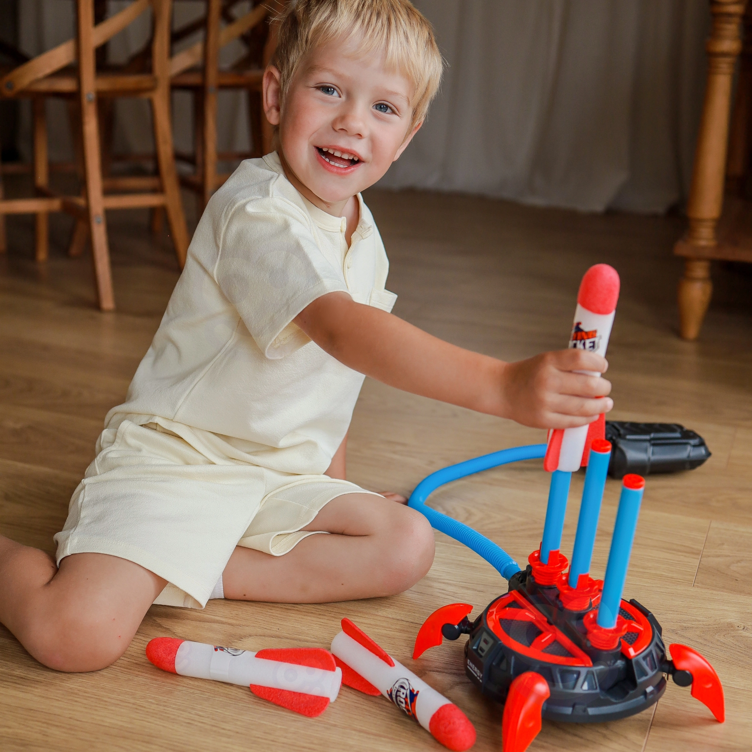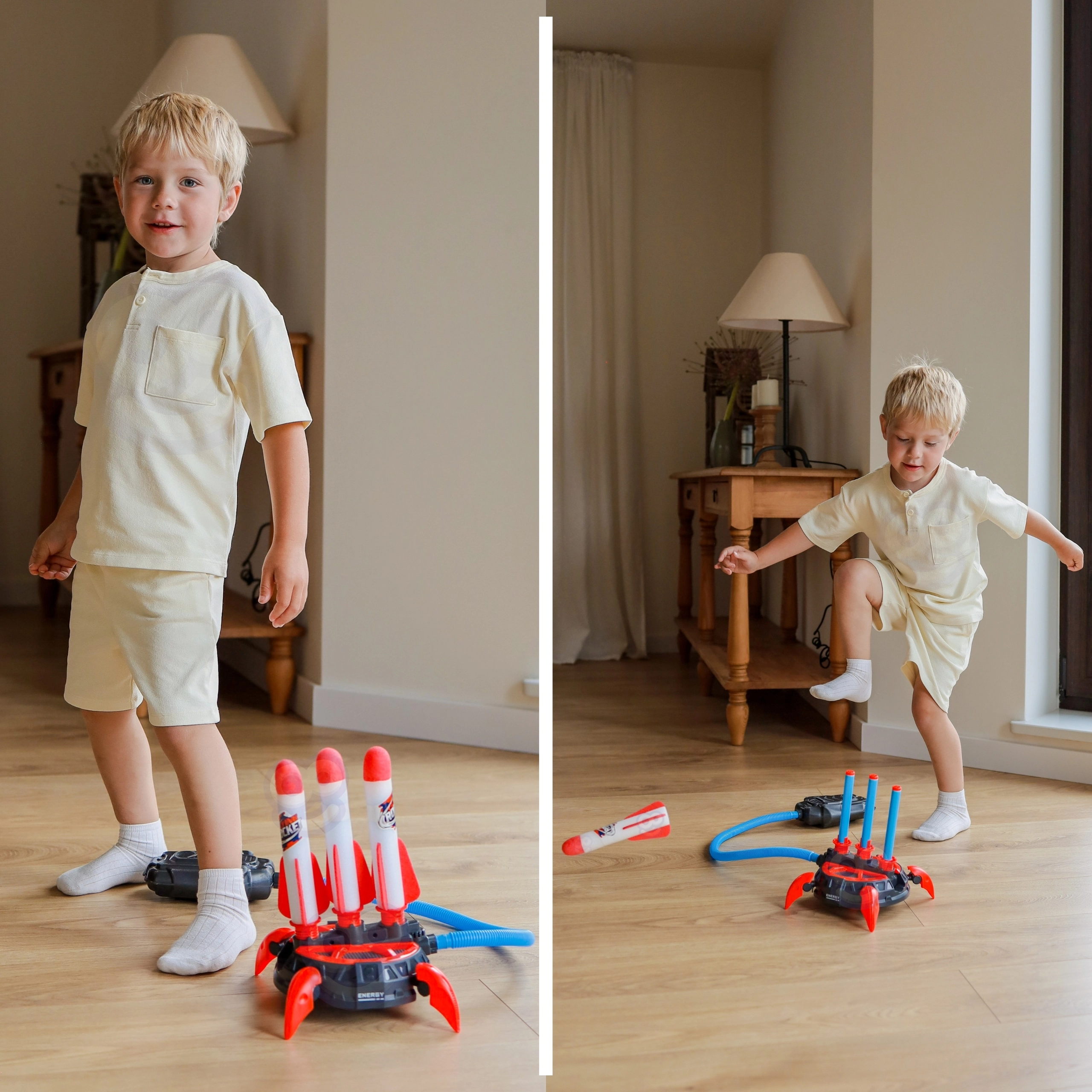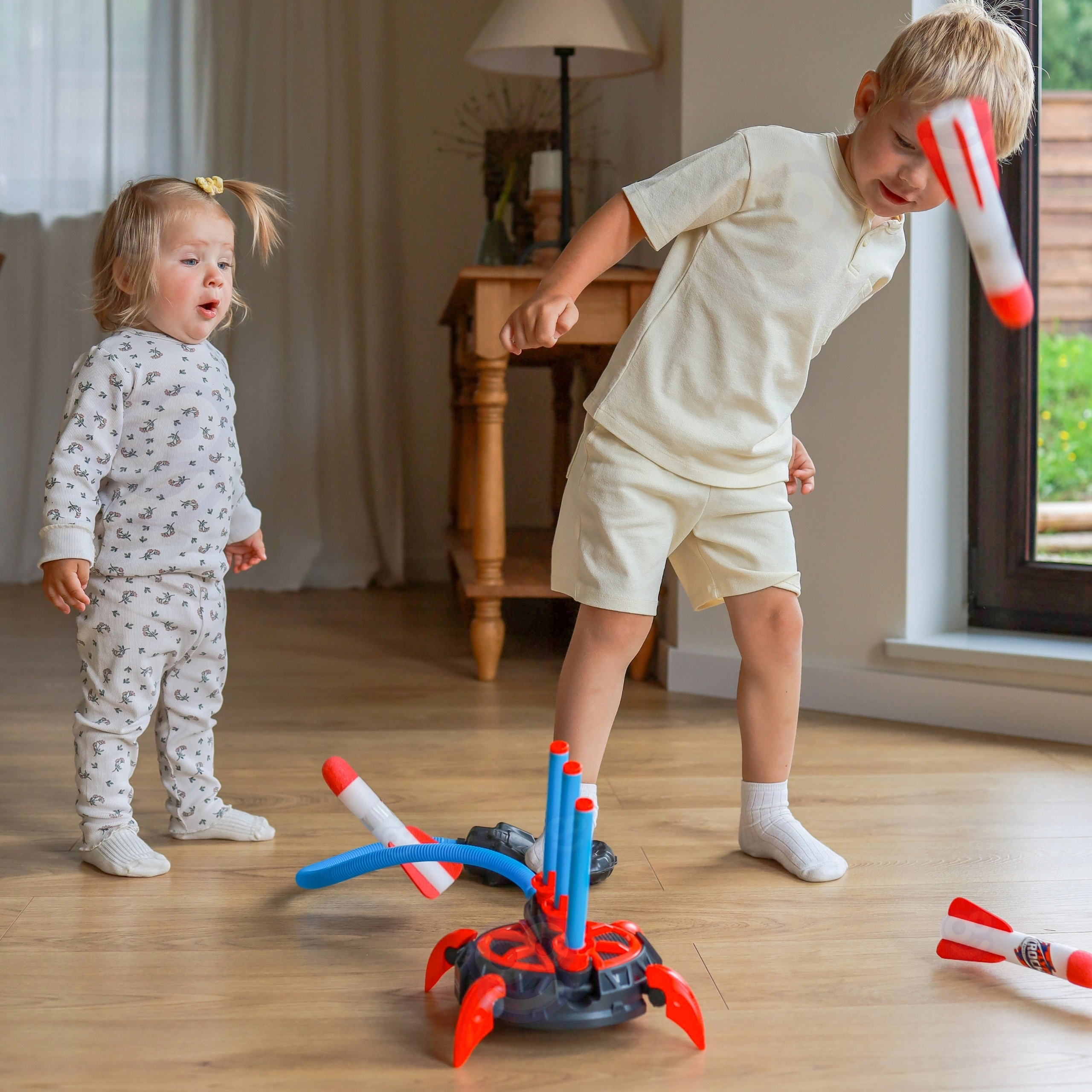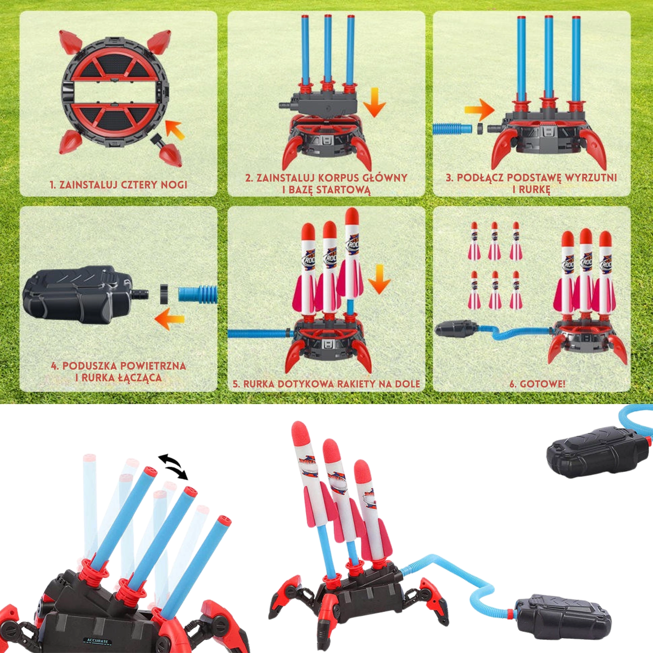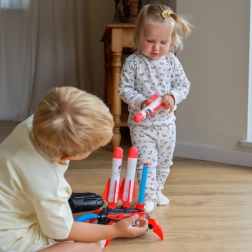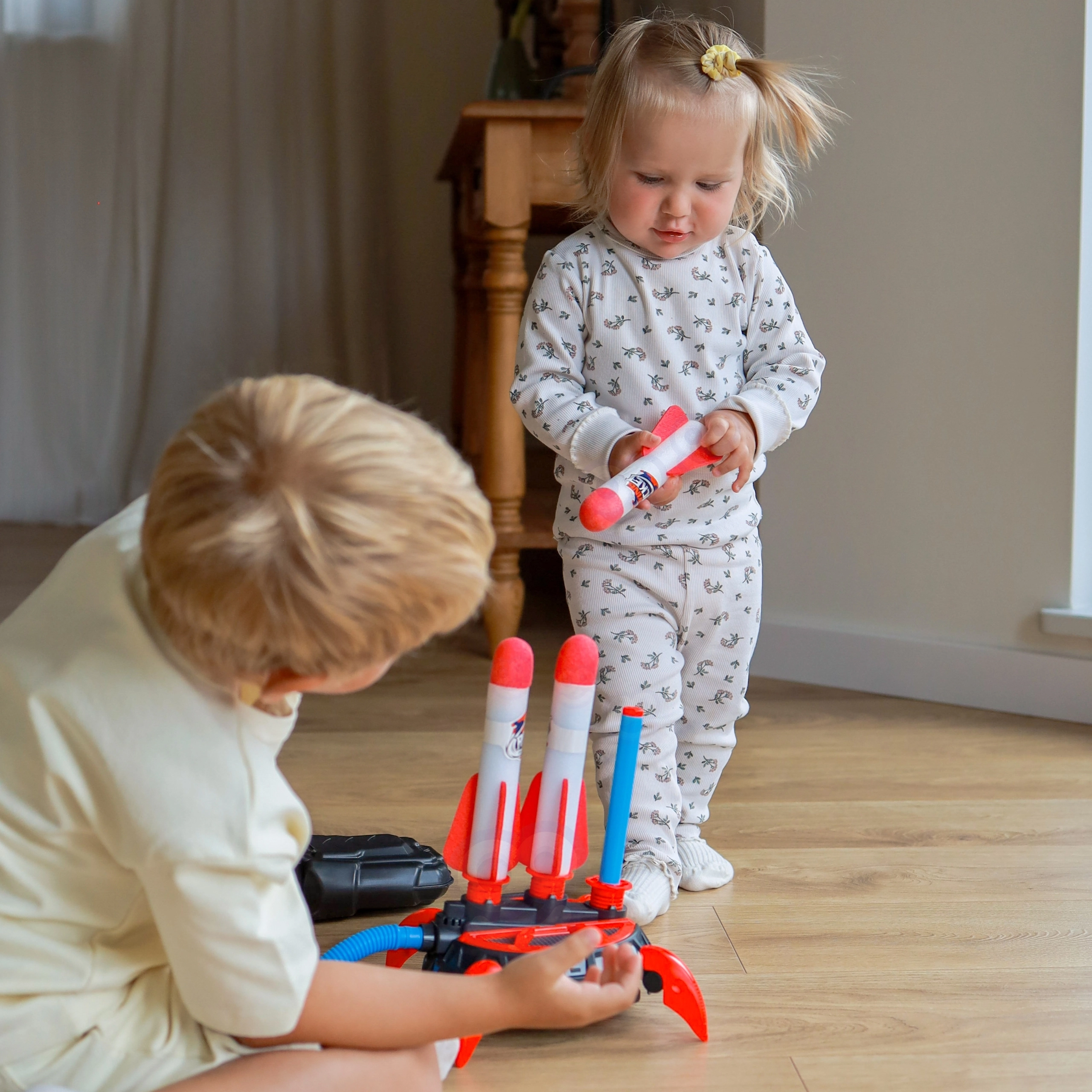 Žaislas lavina stambiąją motoriką, koordinaciją ir smalsumą mokslui. Dėl paprasto surinkimo be įrankių jis idealiai tinka sode, parke ir kieme – o minkšti raketų galiukai užtikrina saugų žaidimą be aštrių briaunų.