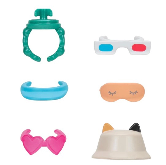 Pakuotėje rasite įvairių priedų – akinius, lankelius, skrybėlaitę ar miego kaukę – kuriuos lengva keisti. Tai skatina kūrybiškumą, smulkiąją motoriką ir vaidmenų žaidimus. Rinkinys puikiai tinka dalintis su draugais, keistis figūrėlėmis ir kurti savitus mados derinius.