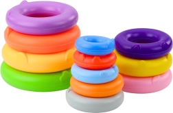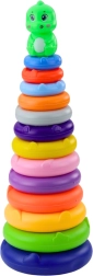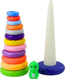 Žaislą sudaro tvirta ir stabili pagrindo plokštė, aukštas strypas ir 13 skirtingo dydžio spalvotų žiedų. Visi elementai pagaminti iš lengvo ir patvaraus plastiko, kuris yra saugus mažiems vaikams. Aukščiausią bokšto dalį puošia mielo dinozauro figūrėlė, kuri patraukia vaiko dėmesį ir skatina tęsti žaidimą.
