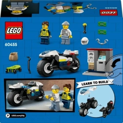 Pradžiuginkite mažus herojus nuo 4 metų su LEGO City Policijos motociklo persekiojimo rinkiniu. Jame yra policijos motociklas su plačiomis padangomis, mini bankomatas su banknotu, vagies riedlentė ir 2 minifigūrėlės, suteikiančios valandas kūrybiško žaidimo ir pasakojimų.