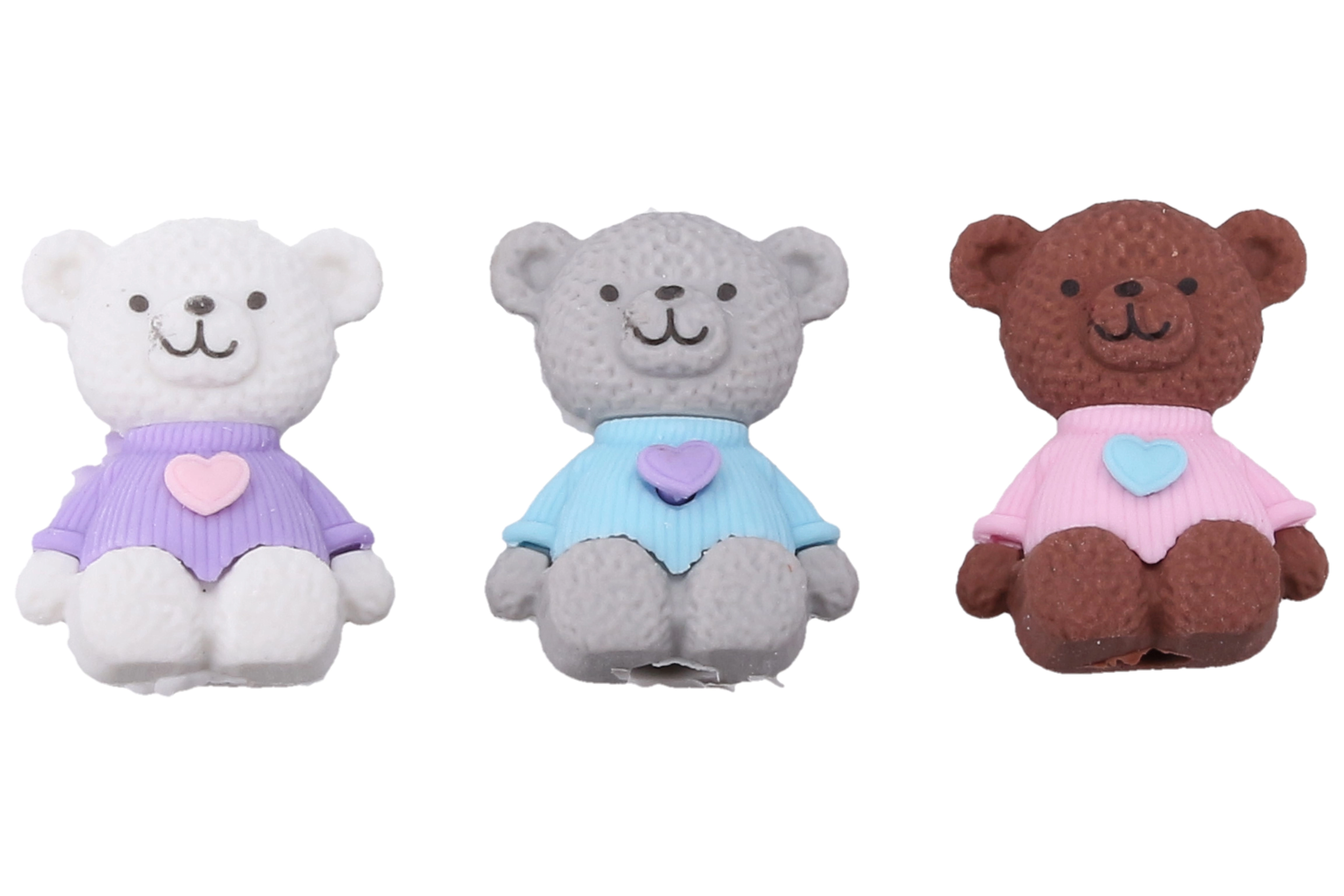 Atraskite fantazijos pasaulį su šiomis meškos formos trintukėmis. Jos puikiai tinka tiek vaikams, tiek suaugusiesiems, ieškantiems savo biuro ir mokyklinių reikmenų paįvairinimo. Pakuotėje rasite šias puikias savybes: