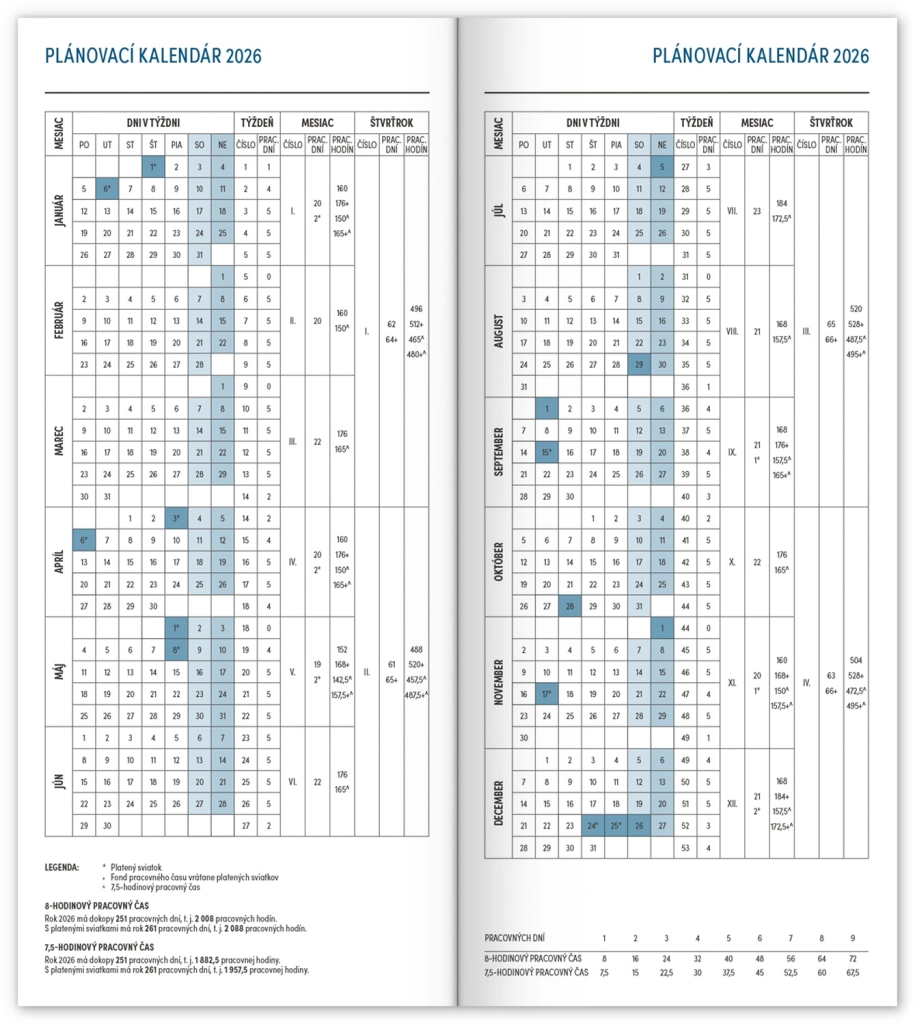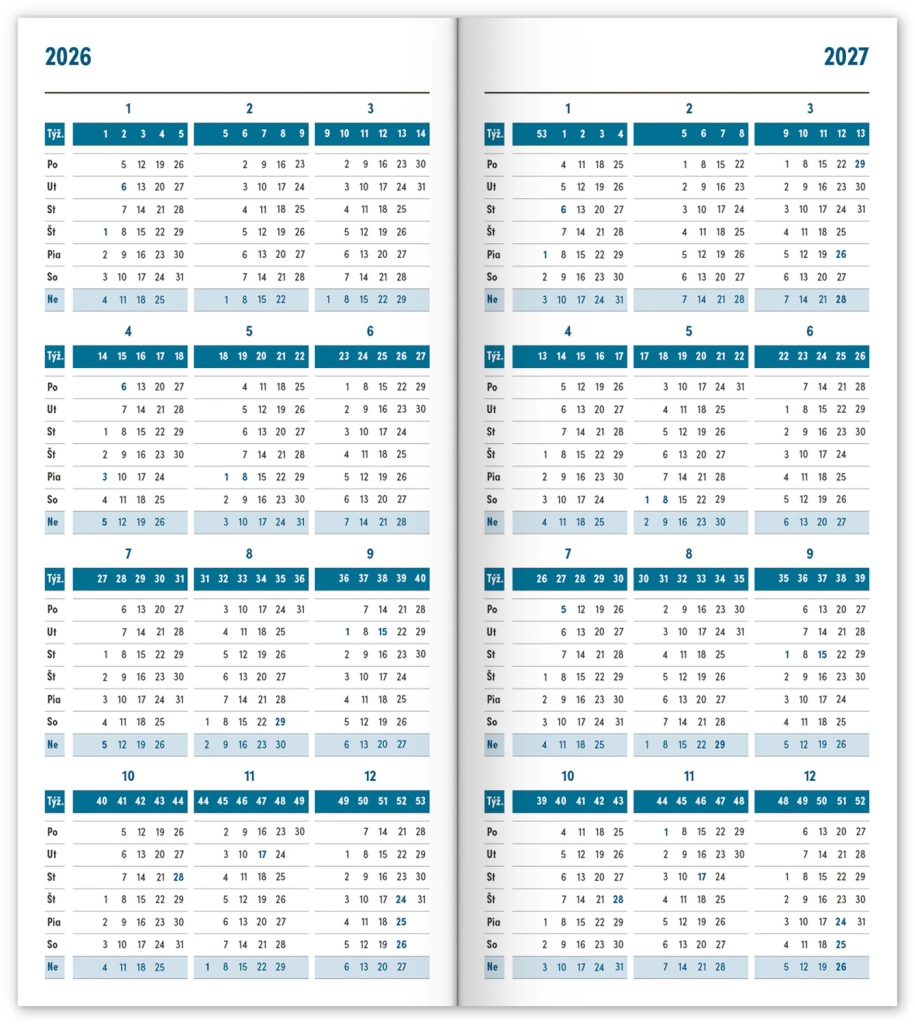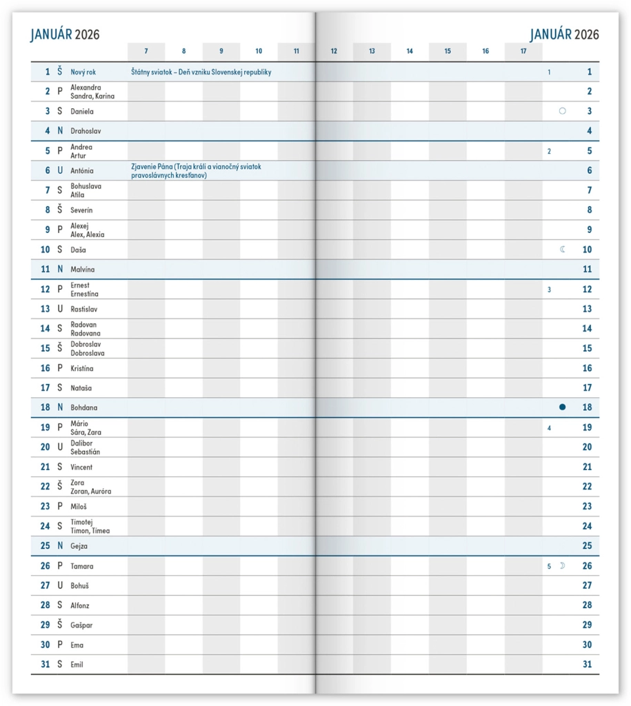 Praktiškas plonas dienoraštis mėlynos spalvos su mėnesiniu išdėstymu, kuris tikrai telpa visur. Sudėtyje yra slovakiškas kalendorius, šventės ir atmintinos dienos.