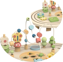 - - Sensorinė stimuliacija: Medinė tekstūra ir interaktyvūs elementai teikia jutiminius potyrius, kurie skatina pojūčių raidą.