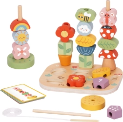 Vėrimas, formų ir spalvų rūšiavimas, bokštų statymas ant kaištukų, poravimas ir žaidimas pagal pavyzdžius – viskas viename kompaktiškame rinkinyje kasdieniam atradimui.