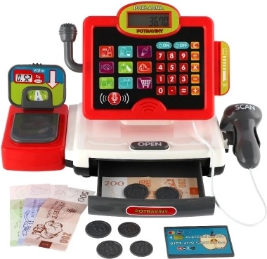 Linksmas ir lavinamasis vaikiškas elektroninis kasos aparatas su priedais mažiesiems prekybininkams. Komplekte yra šviesą ir garsą skleidžiantis skeneris, banknotų ir monetų muliažai, kortelių skaitytuvo lizdas, veikiantis skaičiuotuvas ir vaisių bei daržovių svarstyklės. Idealiai tinka lavinti vaizduotę ir pagrindinius skaičiavimo įgūdžius.