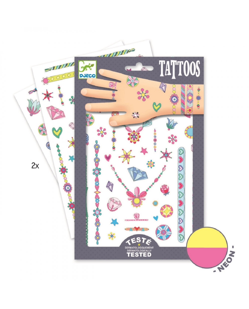 Atraskite DJECO tatuiruočių žavesį, leidžiantį vaikams lavinti vaizduotę ir išreikšti savo asmeninį stilių. Rinkinyje yra įvairių raštų ir motyvų, kurie yra saugūs ir lengvai naudojami.
