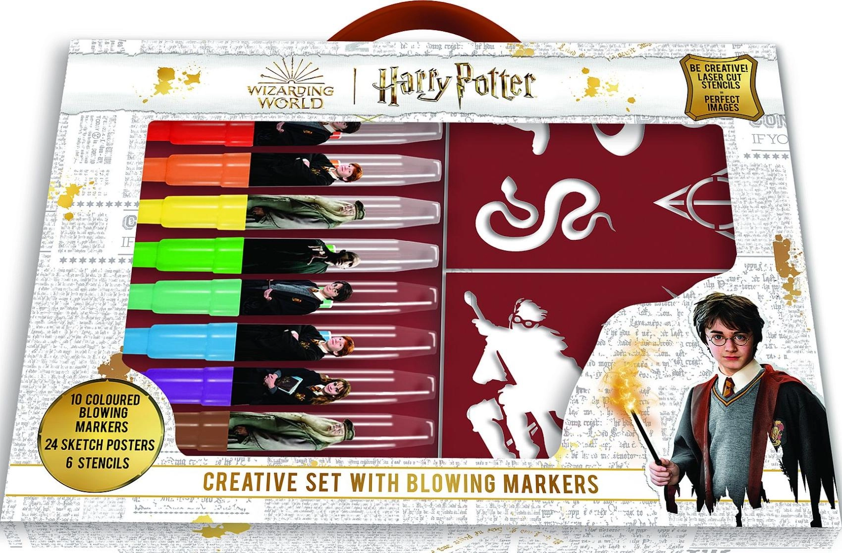 Magija ir pramoga mažiesiems burtininkams. Atrask magijos pasaulį su šiuo kūrybiniu pūčiamų flomasterių rinkiniu su Harį Poterį vaizduojančiais motyvais. Tiesiog įstatyk flomasterį į laikiklį ir pūsk – ir sukursi originalų purškimo efektą.
