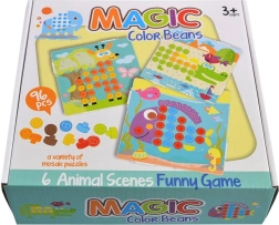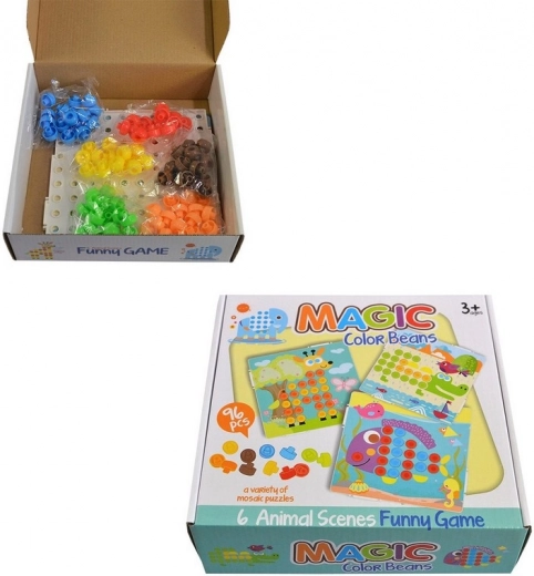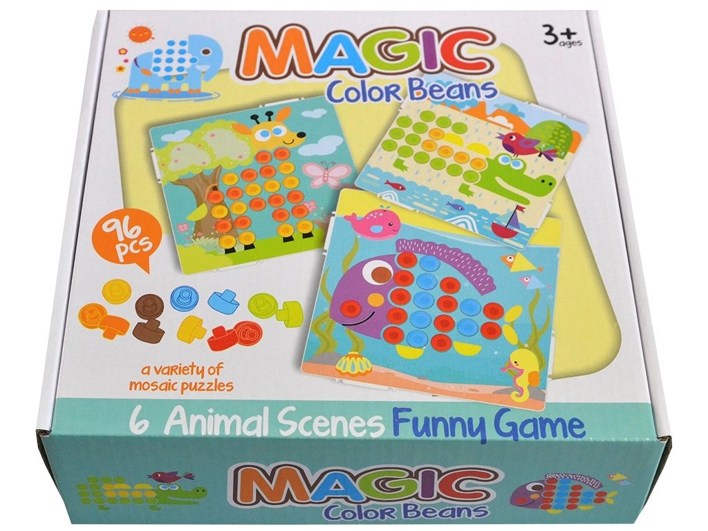 Mozaika su spalvotais trafaretais – ideali kūrybingiems vaikams. Rinkinyje yra 6 skirtingos aplinkos, kuriose gyvena gyvūnai. Vaikai gali papildyti gyvūnų kūnus ryškiaspalviais smeigtukais.