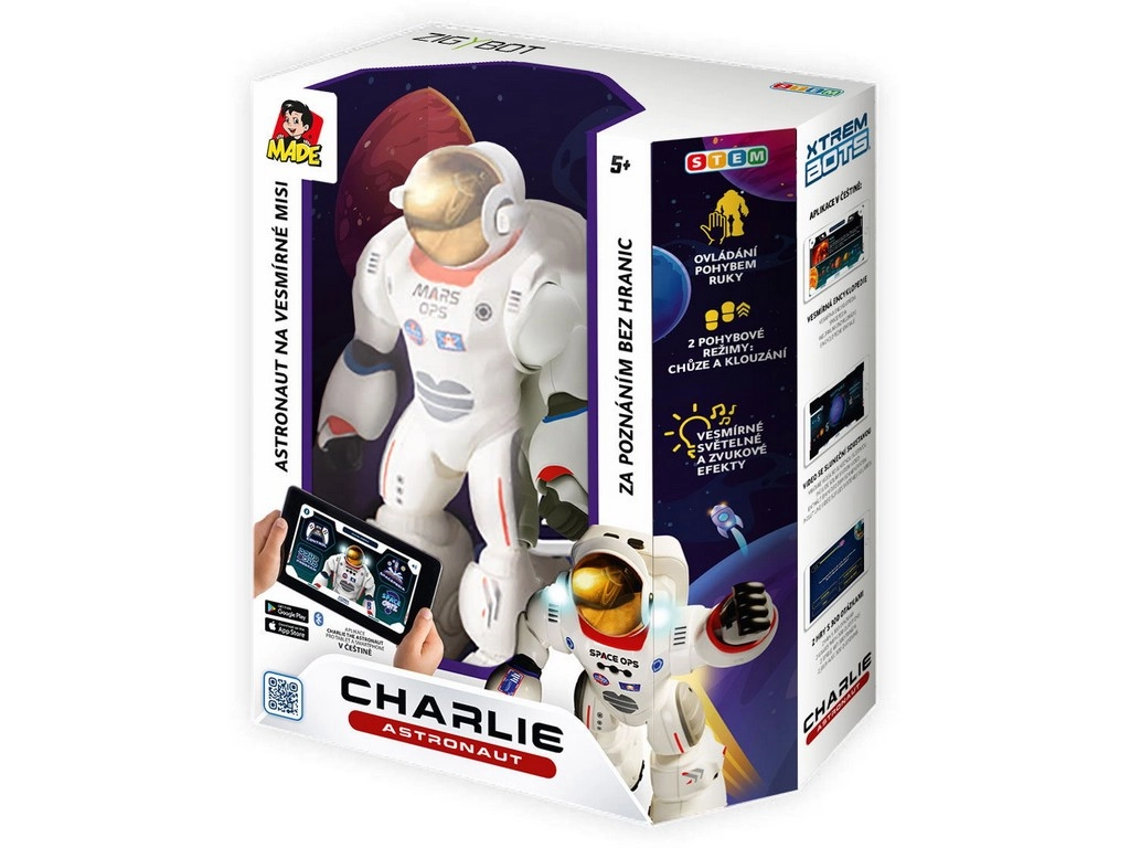 Naudodami mokomąją programėlę galite suplanuoti iki 200 judesių ir mėgautis funkcijomis, tokiomis kaip Kosmopedija arba linksmas Kosmo viktorina, kuri tikrina jūsų žinias apie kosmosą. Be to, Čarlis turi šviesos ir garso efektus, suteikiančius jam dar realesnį įspūdį. Pagamintas iš patvaraus plastiko ir maitinamas trimis 1,5 V AA tipo baterijomis, jis pasirengęs bet kokiam kosminiam nuotykiui. Čekiškas dėžutės dizainas ir daugiakalbė programėlė, įskaitant čekų kalbą, užtikrina, kad robotas yra puikus pasirinkimas kiekvienam, norinčiam vienu metu ir pramogauti, ir mokytis!
