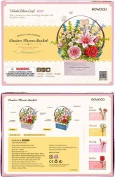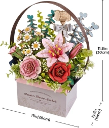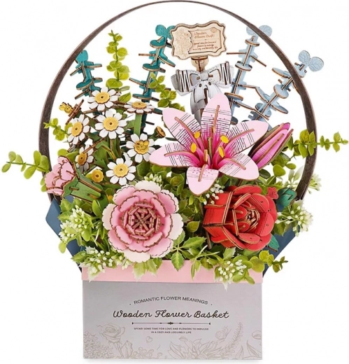 RoboTime 3D medinė dėlionė Gėlių Krepšelis suteikia išskirtinę kūrybos patirtį. Gėlės, tokios kaip rožinė lelija, raudona rožė ar rožinis gvazdikas, simbolizuoja susižavėjimą, aistrą ir dėkingumą. 3D modeliavimas padeda lavinti smulkiąją motoriką, loginį mąstymą ir kantrybę. Puiki puošmena arba dovana kūrybingiems žmonėms. Dėlionę sudaro 428 lazeriu tiksliai išpjautos detalės, kurios lengvai susijungia tarpusavyje, taip sukurdamos stabilų ir patvarų modelį. Krepšelyje yra angos, kad galėtumėte patogiai komponuoti gėles pagal savo fantaziją.