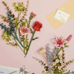 Rinkinyje yra visos reikalingos detalės: medinis krepšelis, rožinė lelija, raudona rožė, ramunė, rožinis gvazdikas, eukaliptas ir dekoratyviniai augalai. Šis rinkinys pateikiamas neišrinktas, su išsamiomis surinkimo instrukcijomis.