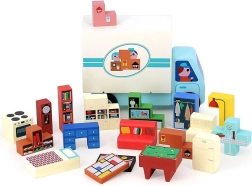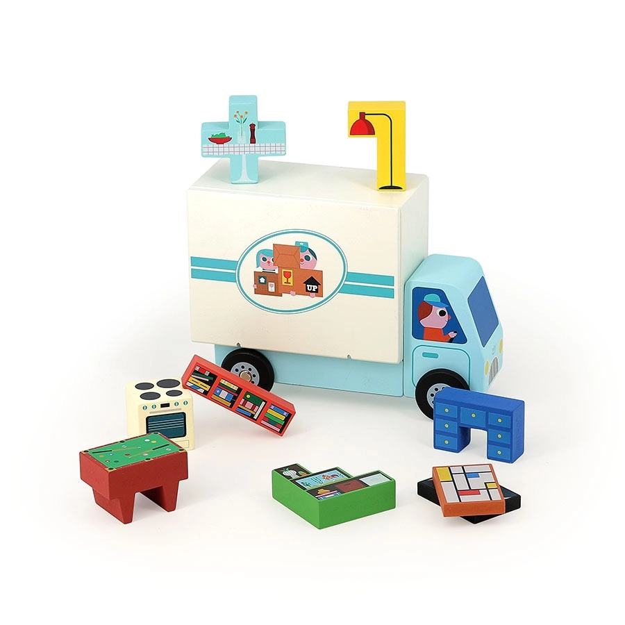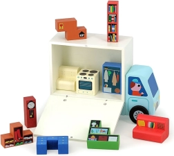 Rinkinyje yra medinis kraustymosi sunkvežimis ir 19 baldų kaladėlių, puikiai tinkančių tiek savarankiškam, tiek bendram žaidimui su šeima.