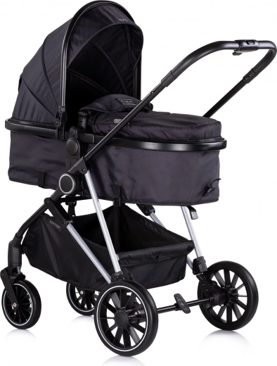 Sportinę sėdimąją dalį lengvai paversite į gilią lopšio tipo dalį kūdikiui iki 6 mėn. Pasukama sėdimoji dalis (tiek važiavimo kryptimi, tiek prieš ją), 3 padėčių atlošas, nuimamas vaikiškas buomelis ir paminkštinti 5 taškų diržai užtikrina komfortą ir saugumą. Amortizuoti, nuimami ratai su jungiamuoju stabdžiu ir didelis daiktų krepšys (iki 2 kg) paverčia vežimėlį patikimu palydovu mieste ir parke.