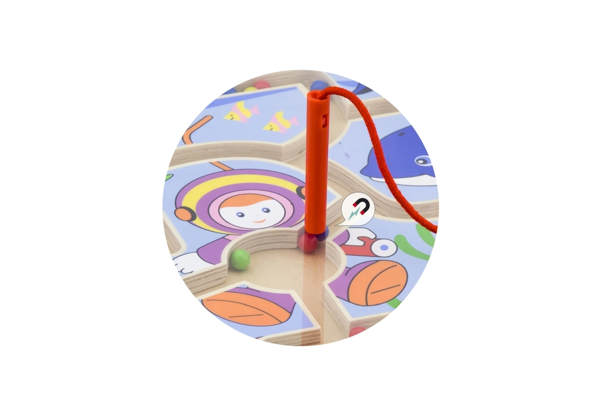 Magnetinė lazdelė veda kamuoliukus per labirintą ir natūraliai treniruoja suėmimą, akių–rankų koordinaciją bei kantrybę atliekant užduotis.