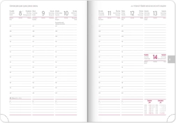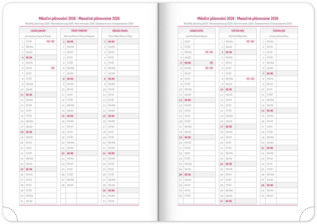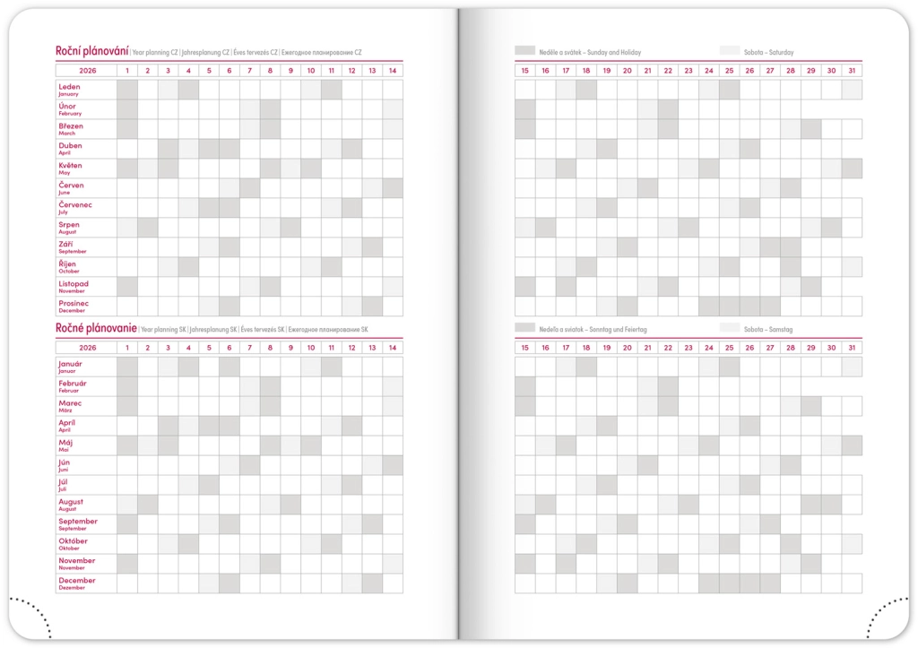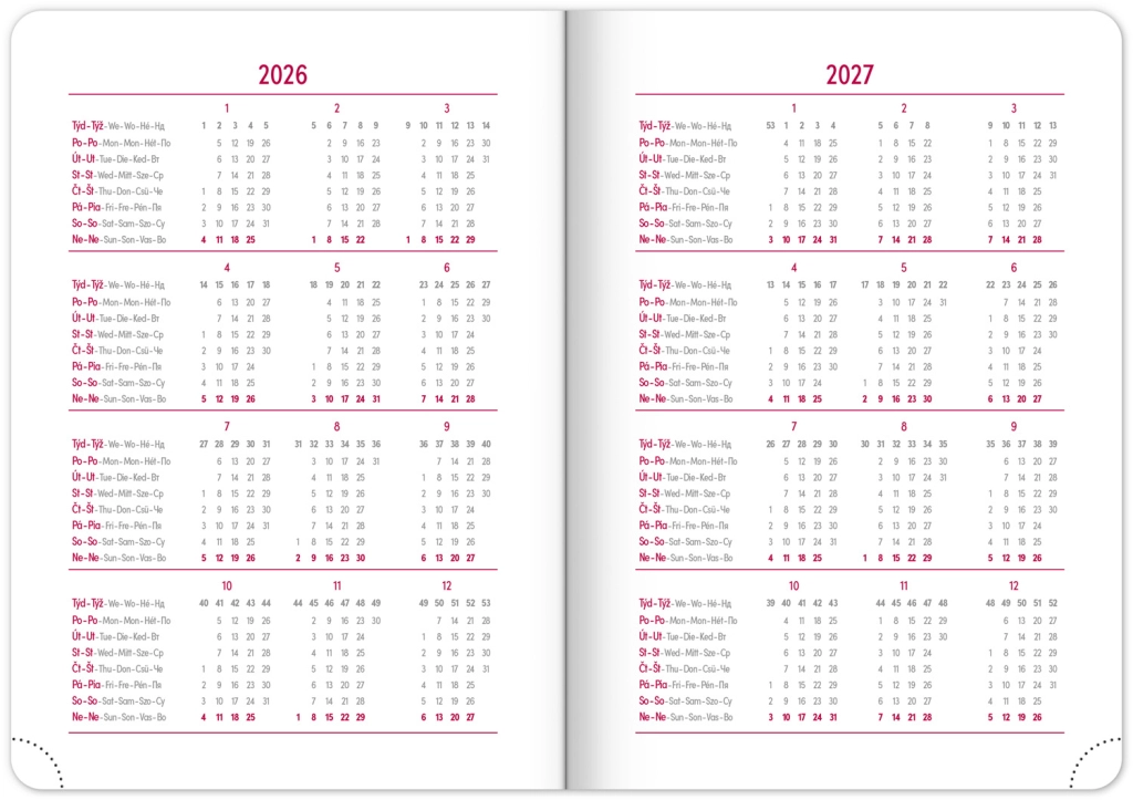 Elegantiškas savaitinis dienoraštis Ajax 2026 auksinės spalvos, su švelniai struktūruotu paviršiumi ir netipiniu reljefu, yra idealus palydovas kiekvienai dienai. Dėl čekų–slovakų kalendoriaus ir papildomos anglų, vokiečių, vengrų bei rusų kalbų jis yra praktiškas ir pritaikomas kiekvienam.