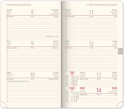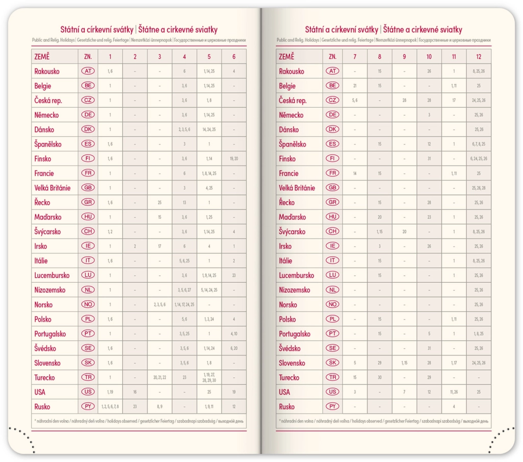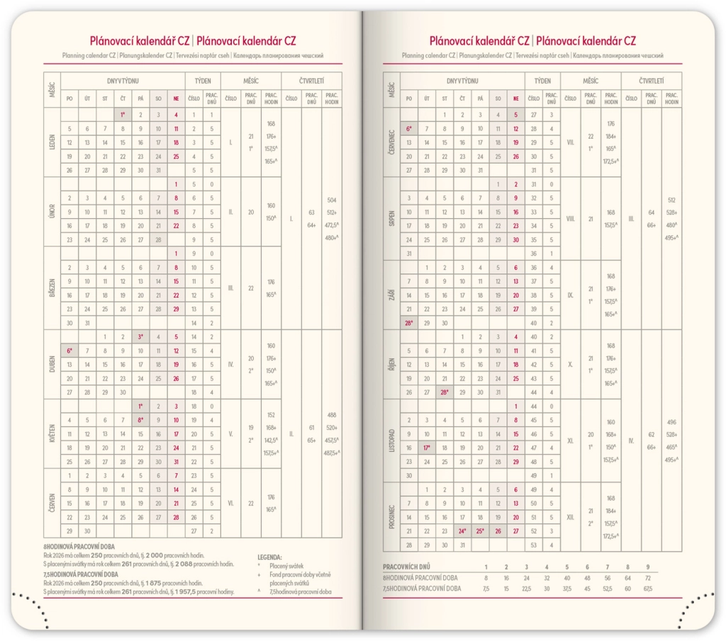 Dienoraštis Diamante 2026 siūlo savaitinį išdėstymą su čekų–slovakų kalendoriumi, papildytu anglų, vokiečių, vengrų ir rusų kalbomis. Jo praktiškumą užtikrina: