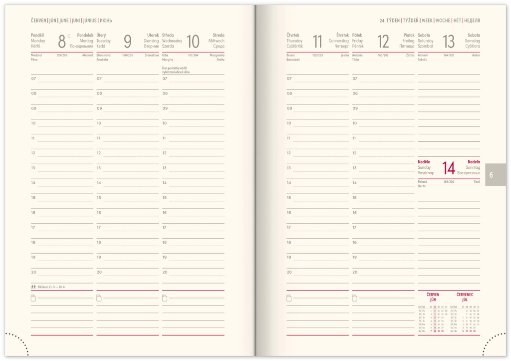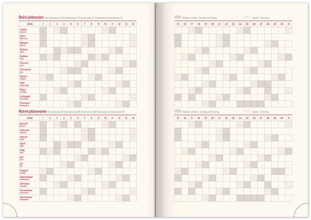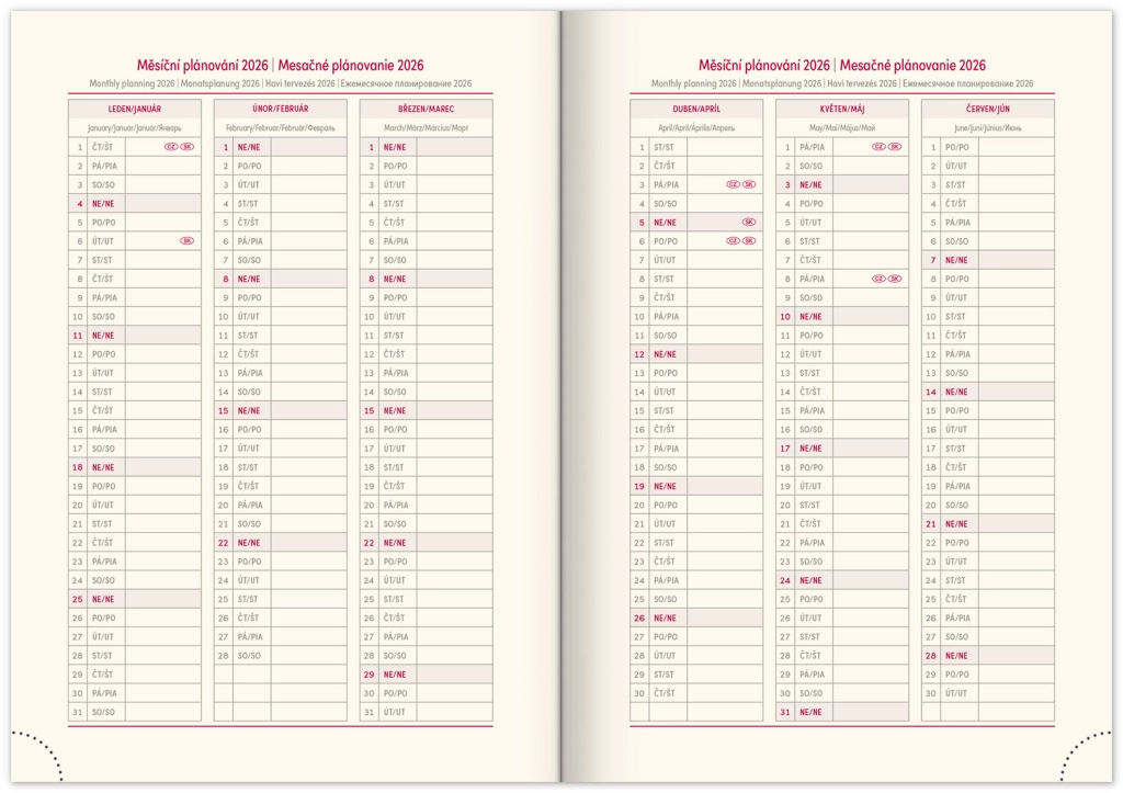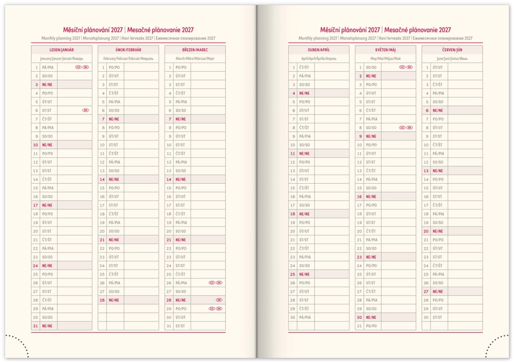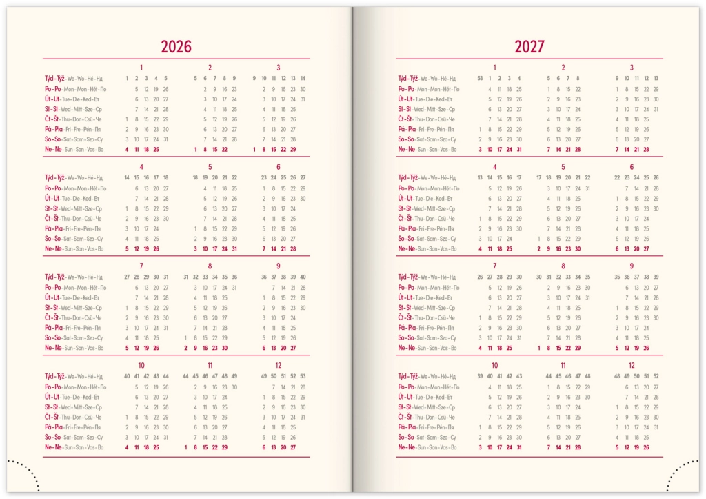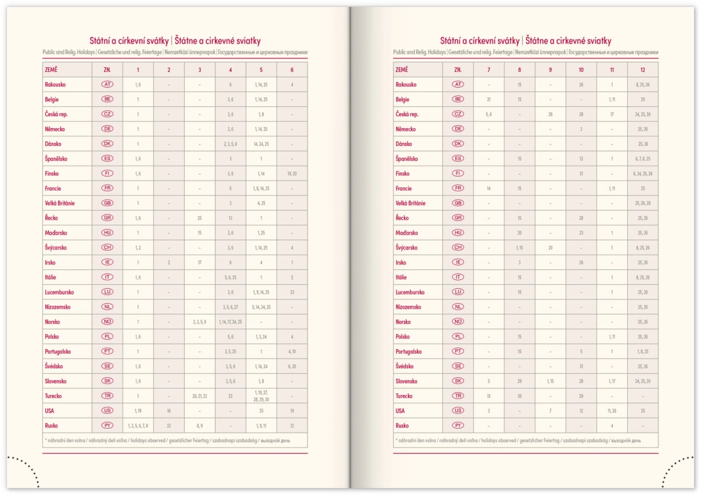 - Savaitinis išdėstymas su čekų–slovakų kalendoriumi ir papildomomis kalbomis: anglų, vokiečių, vengrų ir rusų.