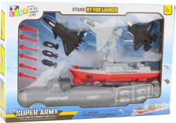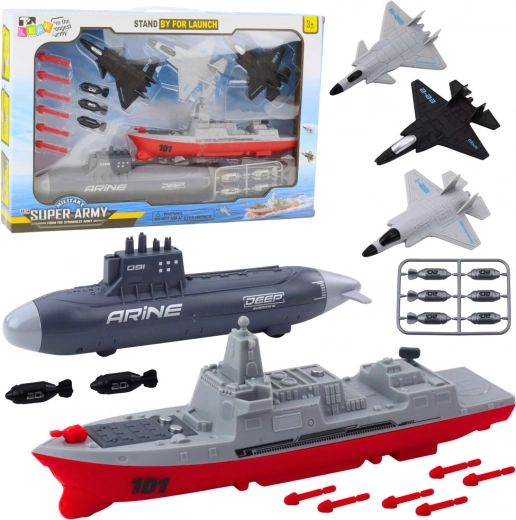 Šis unikalus karinis rinkinys leidžia vaikams patirti įtraukiančius mūšius jūroje ir ore. Pagamintas iš kokybiško plastiko, paprastinta vaikams tinkama forma atkuria karinius aparatus. Dėl vietų raketoms ir torpedoms montuoti vaikai gali mėgautis dar daugiau žaidimo veiksmo.