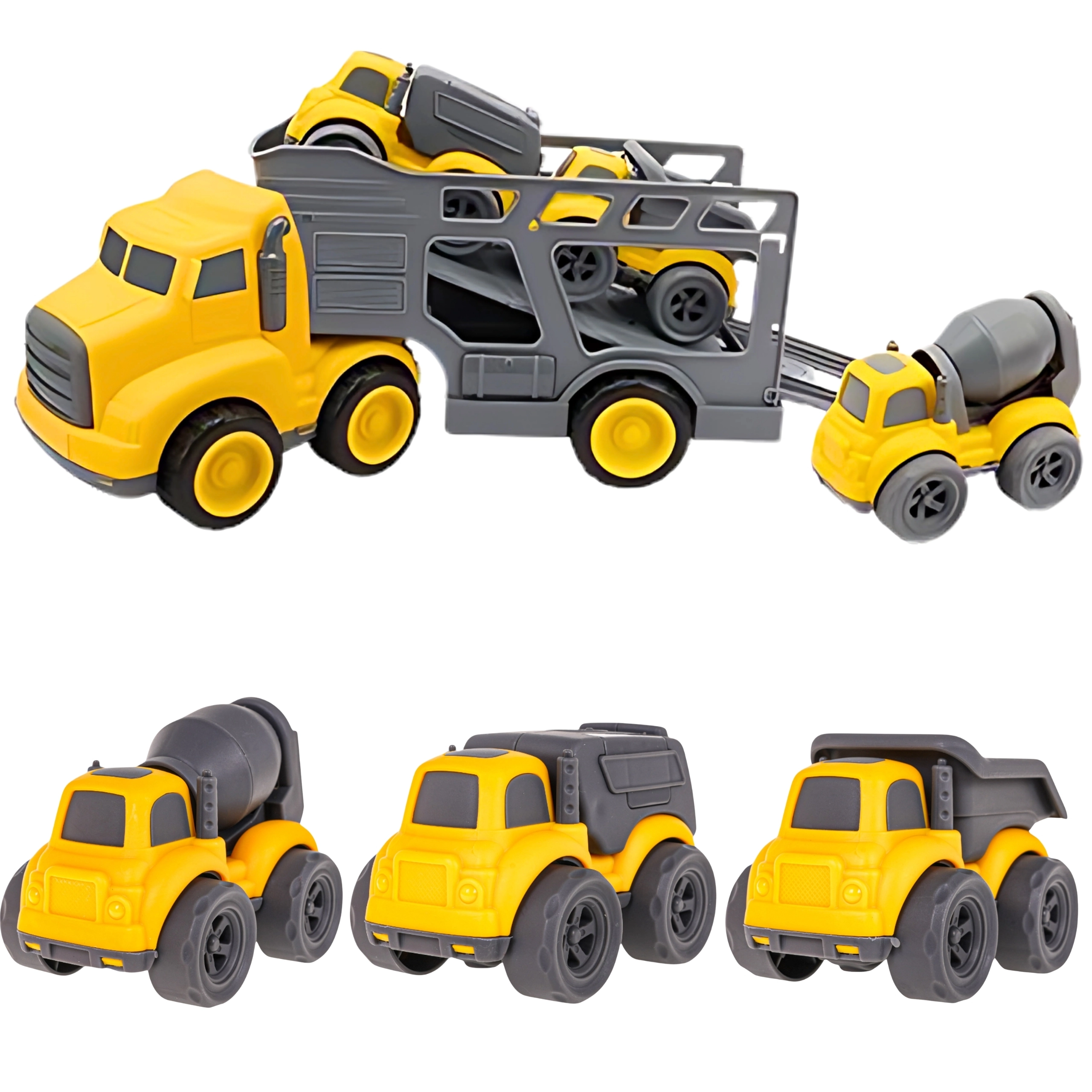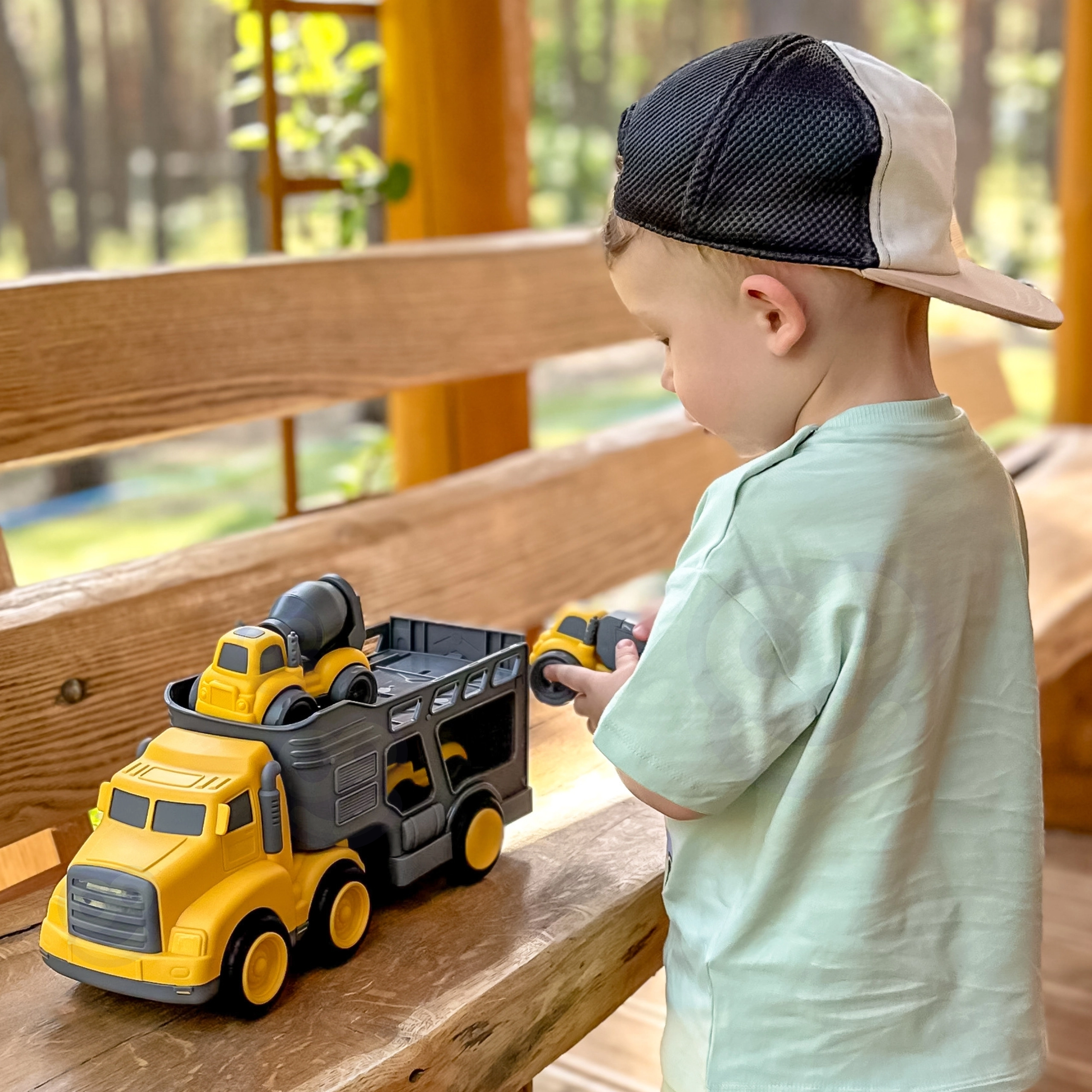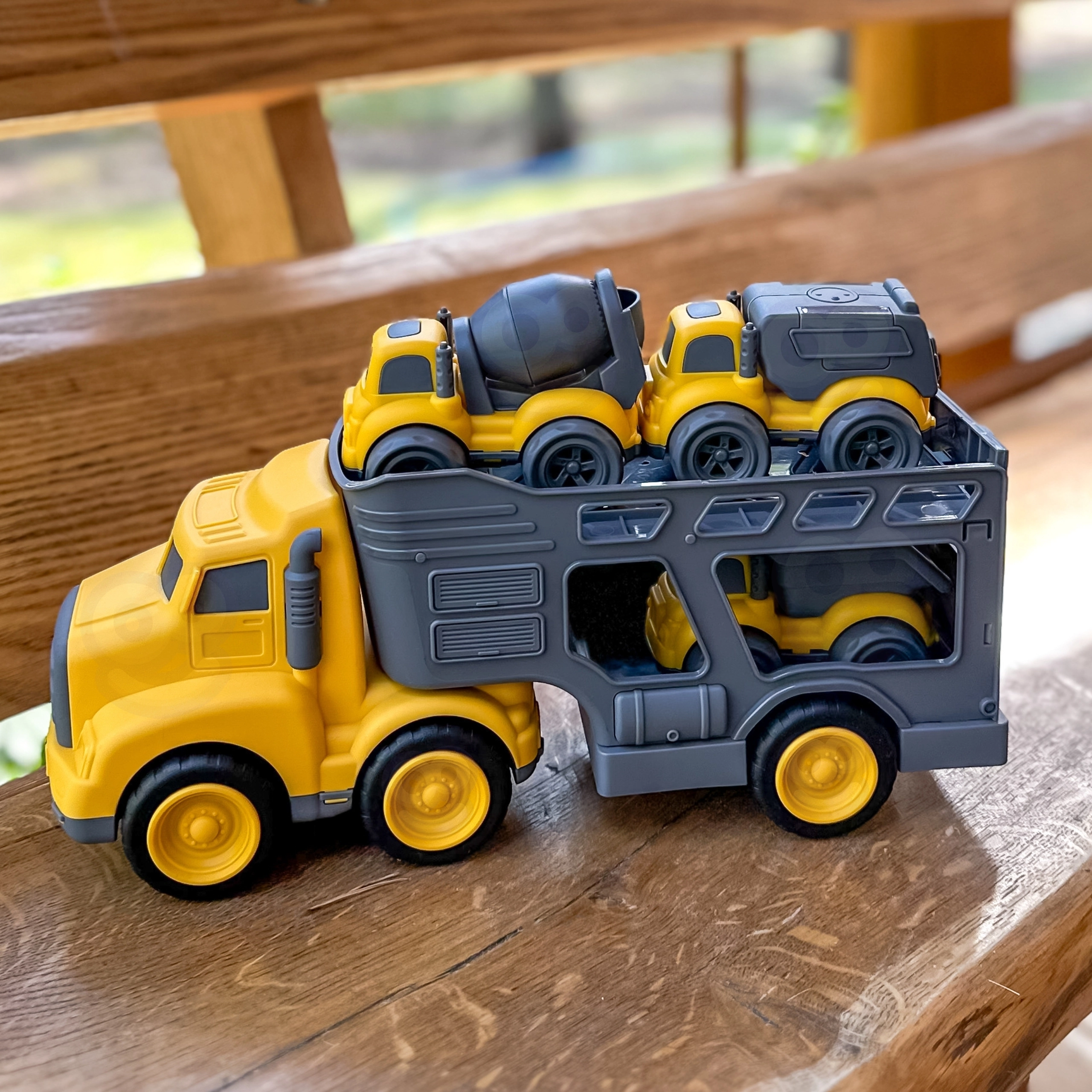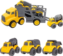 Išvykite į statybų aikštelę su dideliu WOOPIE vilkiku, kuris veža tris mažesnius statybinius automobilius – savarankiškai išsikraunantį sunkvežimį, betono maišyklę ir šiukšliavežę. Kiekvienas automobilis turi judančių elementų, užtikrinančių realistišką ir įtraukiančią žaidimą. Rinkinys išsiskiria tvirta ir saugia konstrukcija, ryškiomis spalvomis ir dėmesiu detalėms – valandoms kūrybiško žaidimo vaikams nuo 3 metų.
