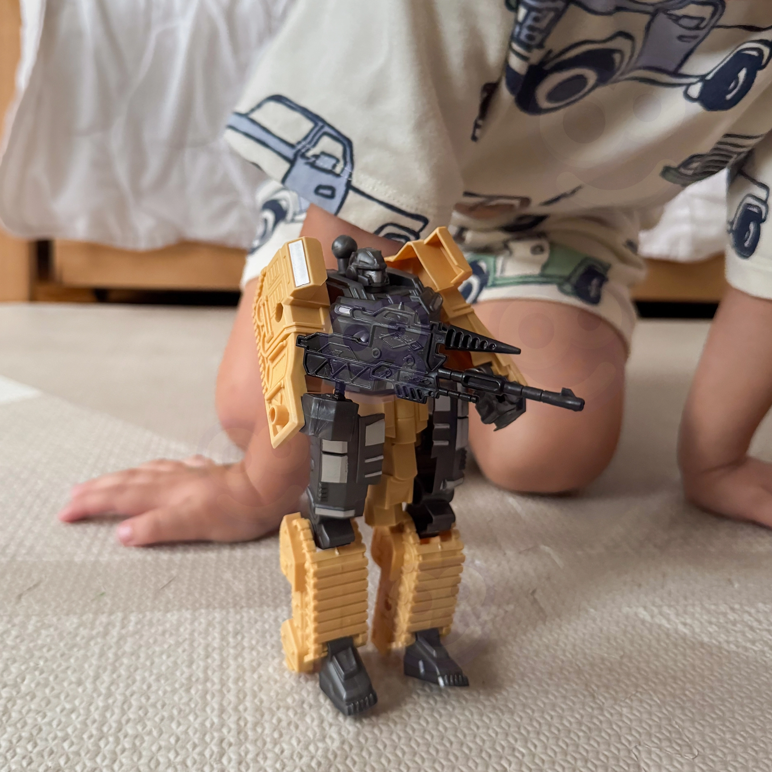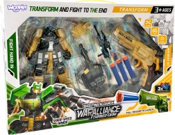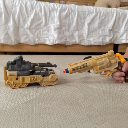 Rinkinio turinys: 1× transformuojamas robotas/tankas, 1× pistoletas (revolveris), 3× putų strėlė, papildomi koviniai priedai.