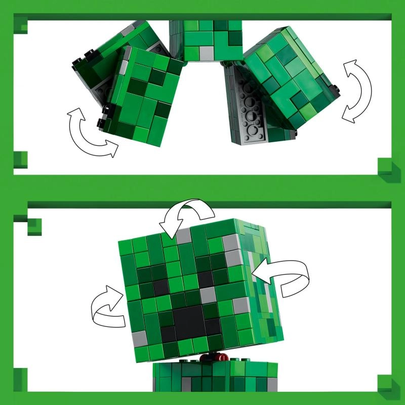 Pastatykite legendinį MINECRAFT priešininką! Didelė LEGO Creeper figūrėlė siūlo judančią galvą ir kojas, paslėptą skyrelį su mini Creeper versija ir TNT detale – puikiai tinka tiek žaidimams, tiek kaip kambario dekoracija kiekvienam žaidėjui. Ideali dovana vaikams nuo 10 metų ir MINECRAFT gerbėjams.