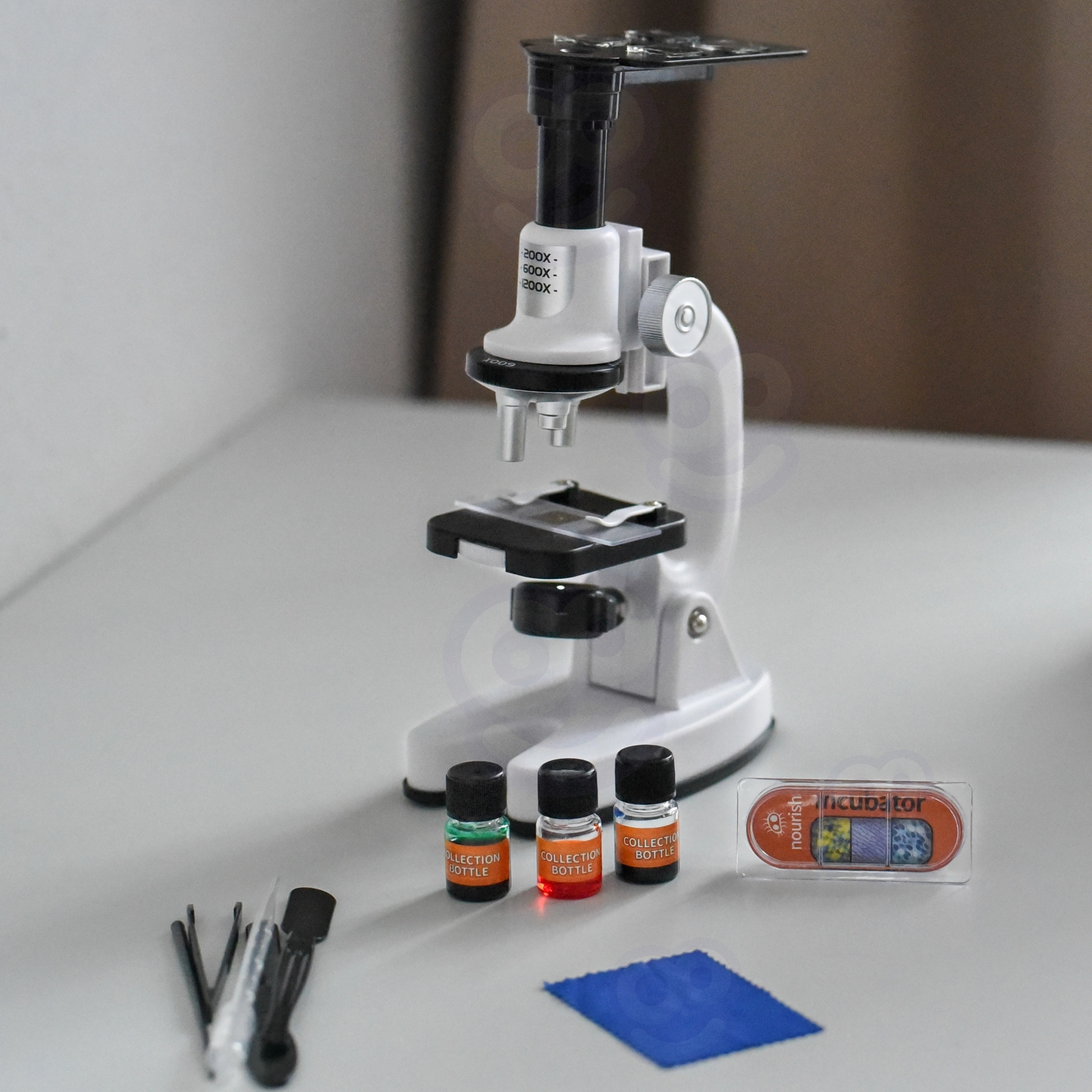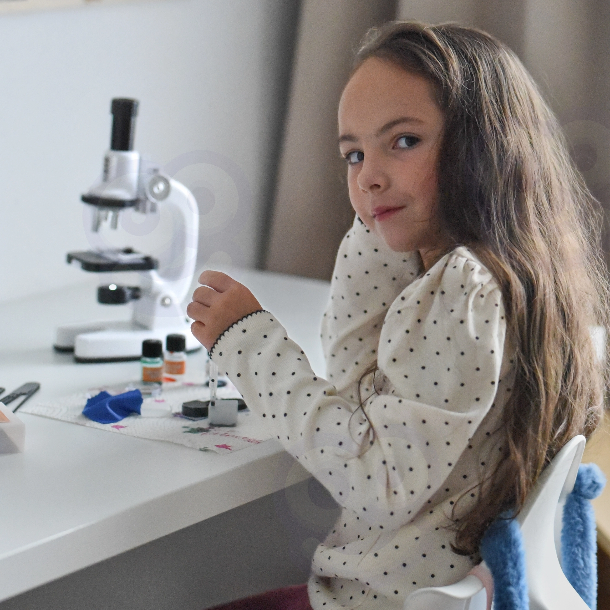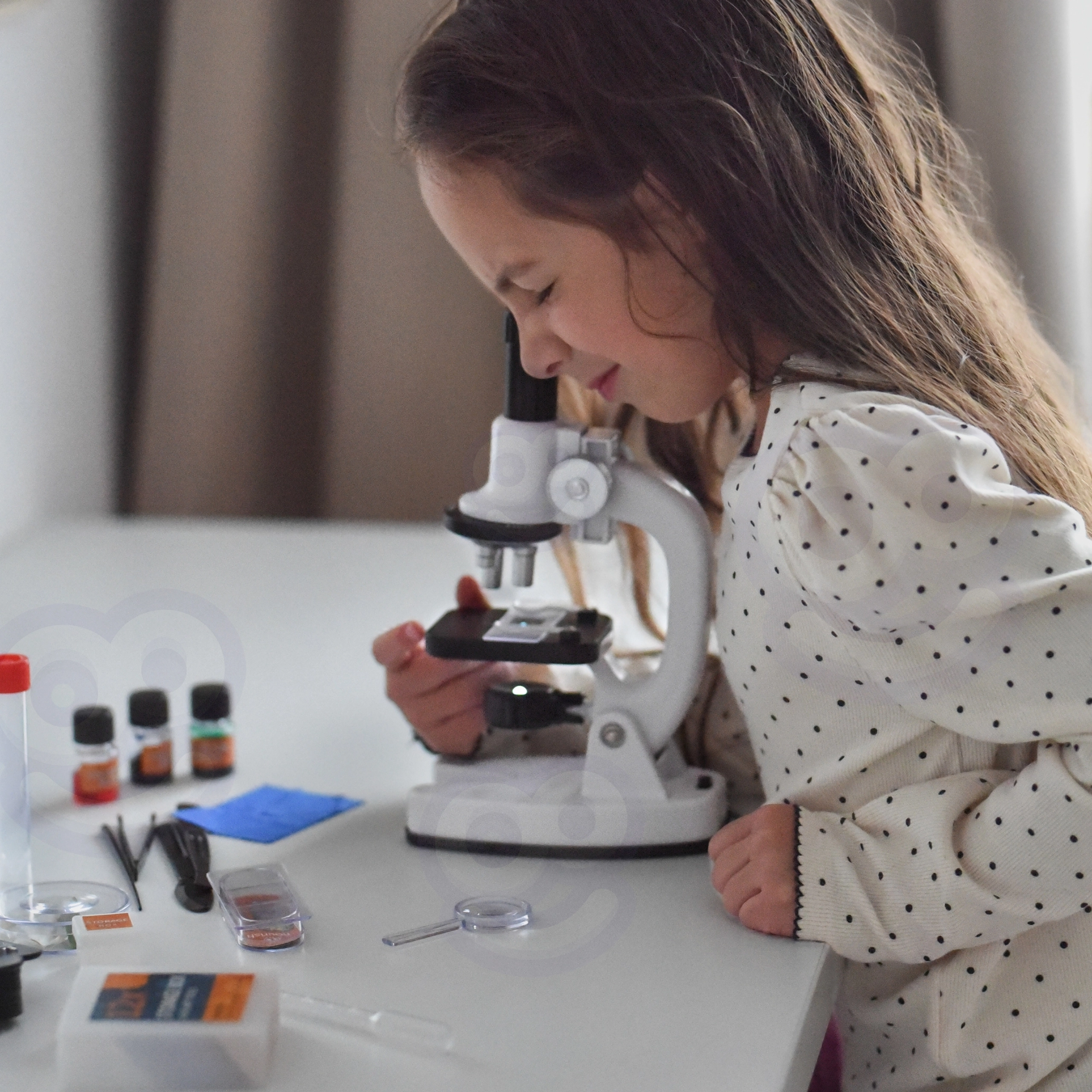 Komplekte yra išmaniojo telefono adapteris, tad galima patogiai fotografuoti ir dalintis stebėjimais. Turtingas priedų rinkinys (stikleliai, buteliukai, pincetas, pipetė ir kt.) užtikrina saugų ir smagų eksperimentavimą, lavina mokslinius įgūdžius, kantrybę ir akies-rankos koordinaciją.