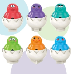 Woopie ženklo žaidybiniai kiaušiniai supažindina jūsų vaiką su pasauliu, kupinu spalvų, formų ir linksmų veidukų. Kiekviename iš šešių mielų kiaušinių slepiasi spalvingas viščiukas su juokingu veiduku, o paspaudus skleidžia garsinį efektą. Užduotis – ne tik sudėti tinkamą lukštą, bet ir padėti jį į teisingą vietą dėkle.