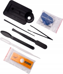 - Rinkinyje yra: mėginių paruošimo įrankiai, standartiniai stikleliai, mėginių laikymo buteliukai, valymo šluostė ir telefono laikiklis.