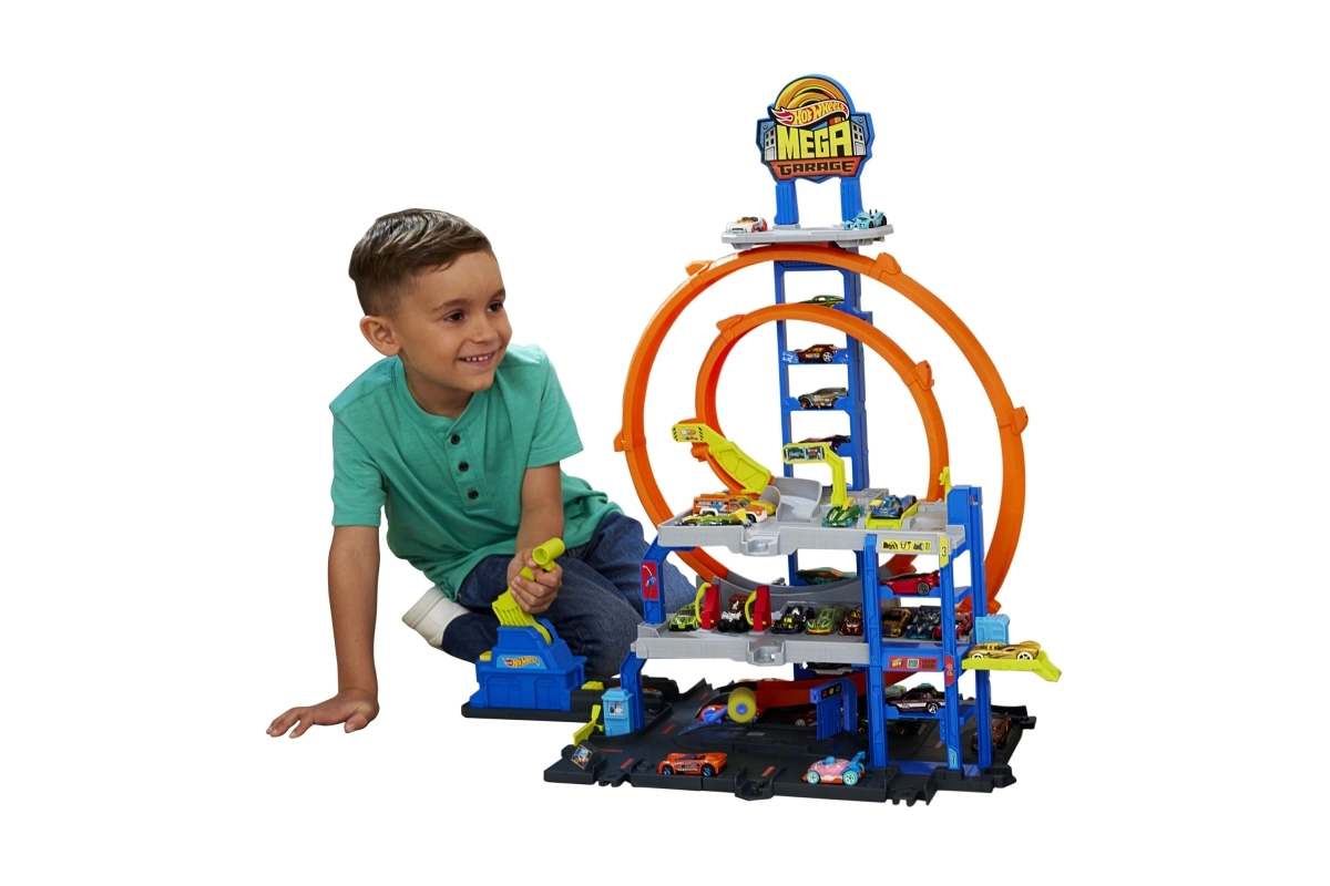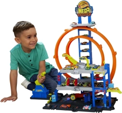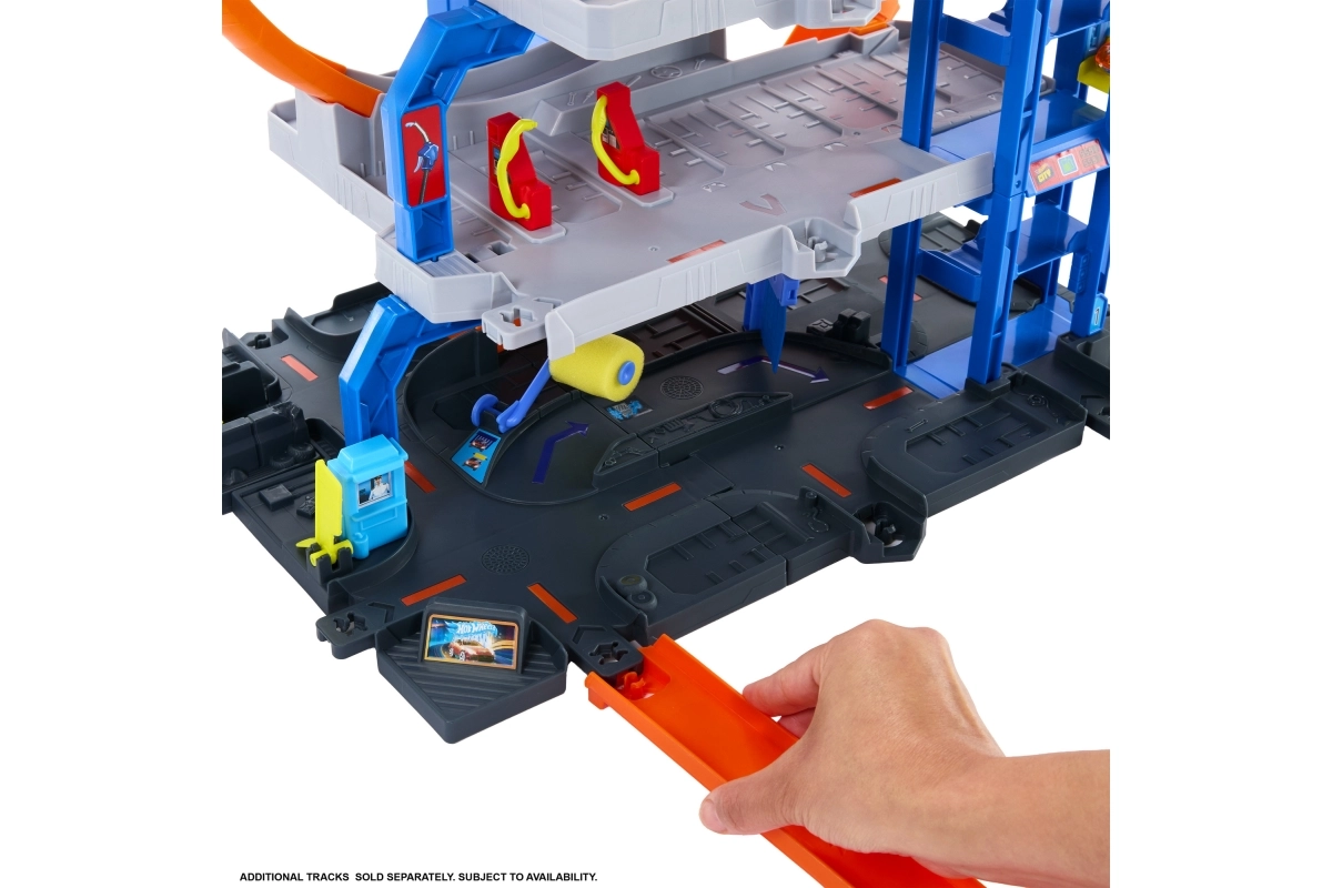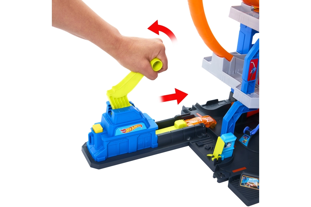Hot Wheels City didžioji garažas suteikia dinamišką žaidimą per tris aukštus – nuo plovyklos pirmame aukšte iki rankinio keltuvo ir starto iš viršutinio lygio. Paleidiklis nukreipia automobilius į dvigubą kilpą, o perjungikliai nusprendžia, į kurį aukštą automobilis pateks. Puikiai tinka tiek solo, tiek bendrai žaidžiant.