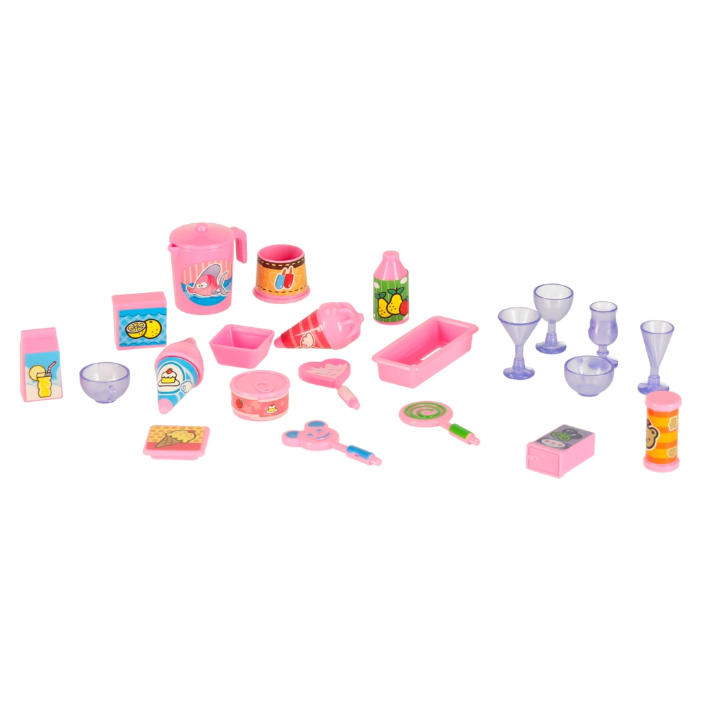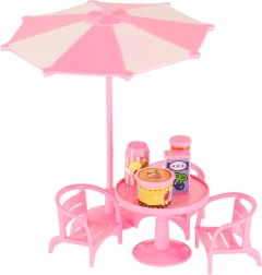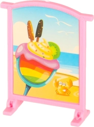 Rinkinyje yra gausus priedų komplektas: staliukai, kėdutės, skėtis, reklaminis stovas ir daugybė smulkių aksesuarų, tokių kaip puodeliai, taurės, ledai, arbatinukas ir lėkštelė. Lengva ir patvari plastikinė konstrukcija puikiai tinka kasdieniam žaidimui namuose ir kelionėse.