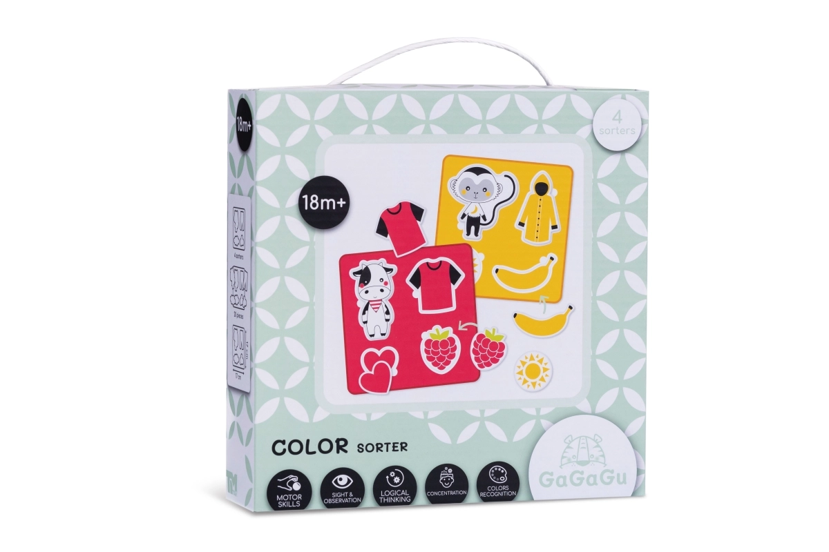 Šis GAGAGU spalvų pažinimo rinkinys suteikia vaikams smagią mokymosi patirtį. Keturių skirtingų spalvų ir sudėtingumo dėlionių lentelės padeda mažiesiems atskirti spalvas, formas ir priderinti detales prie teisingų vietų. Mielų gyvūnėlių ir jų mėgstamo maisto paveikslėliai padeda suprasti ryšius ir praplečia žodyną.
