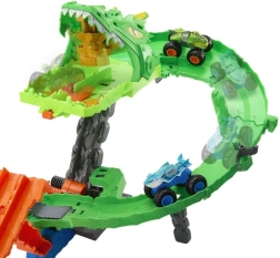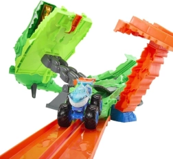 Kai drakonas numuštas, paleisk automobilį į jo nasrus ir laimėk trofėjų! Rinkinys suderinamas su Speed Snap dalimis trasoms plėsti ir veikia su dauguma Hot Wheels transporto priemonių masteliu 1:64. Idealu vaikams nuo 4 metų – tiek YouTube scenoms atkurti, tiek kurti savas istorijas.