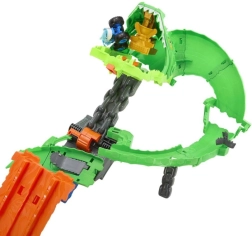 Užkurk adrenaliną teminiame rinkinyje „Rykliai vs. Dinozaurai: Drakų lenktynės“. Įdėk abu sunkvežimius į dvigubą paleidiklį ir leisk juos lygiagrečiomis trasomis tiesiai į kibernetinio drakono nasrus. Apie viską sprendžia pjūklo formos perjungimo svirtis, kuri atsitiktinai nulemia, ar automobiliai sustos, vienas nukris nuo trasos, ar abu pralėks ir partrenks drakoną.