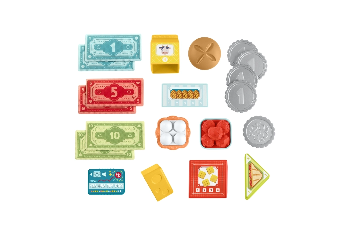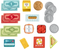 Į komplektą įeina banknotai, monetos, mokėjimo kortelė ir plastikinis maistas – viskas pilniems pirkimo, žymėjimo ir apmokėjimo scenarijams.