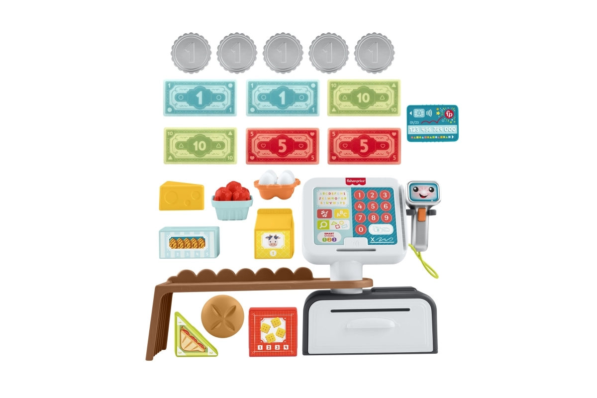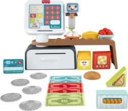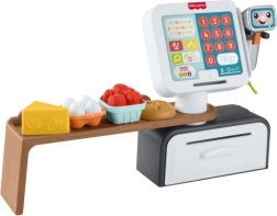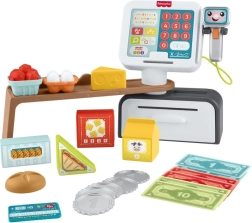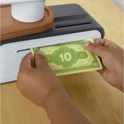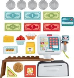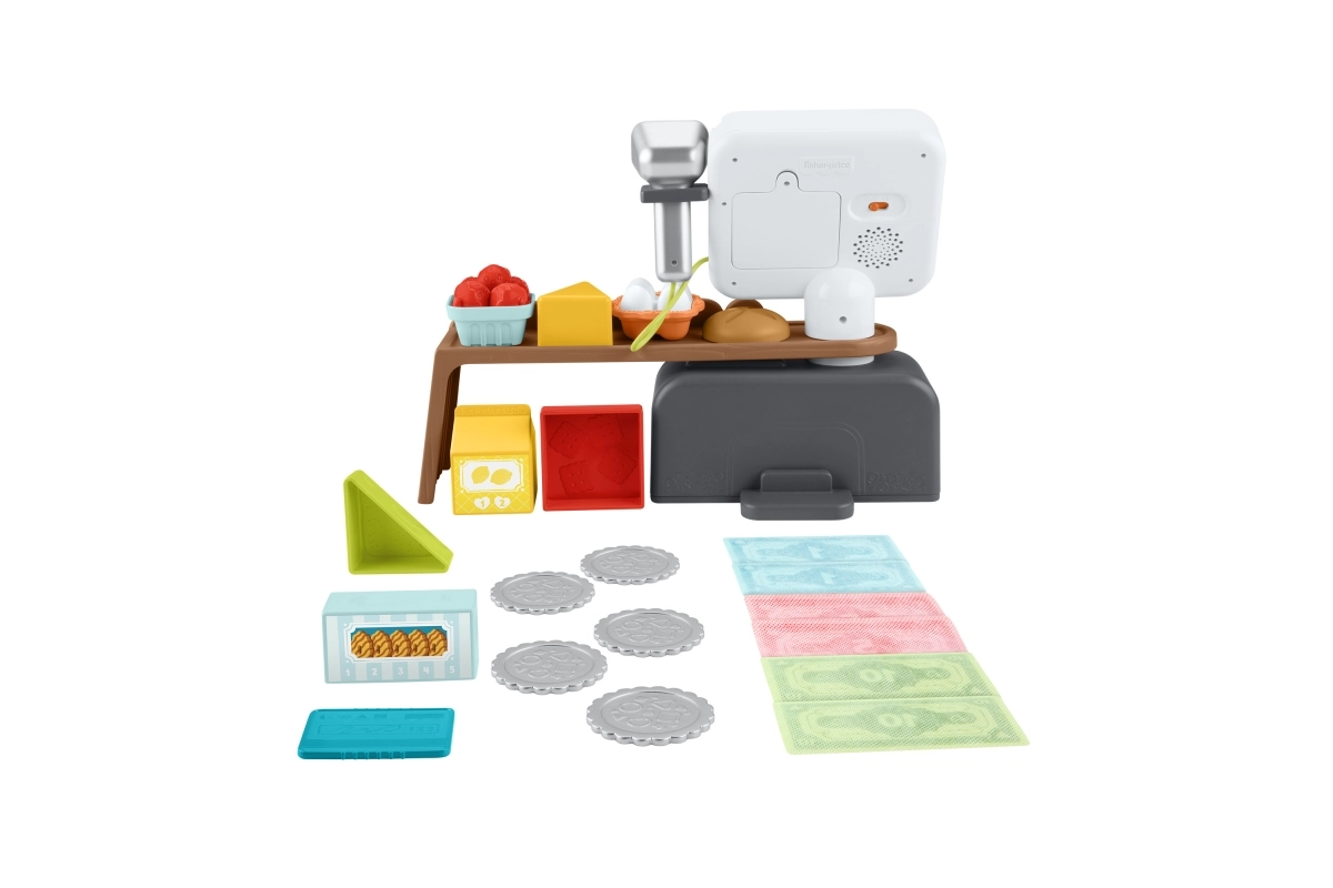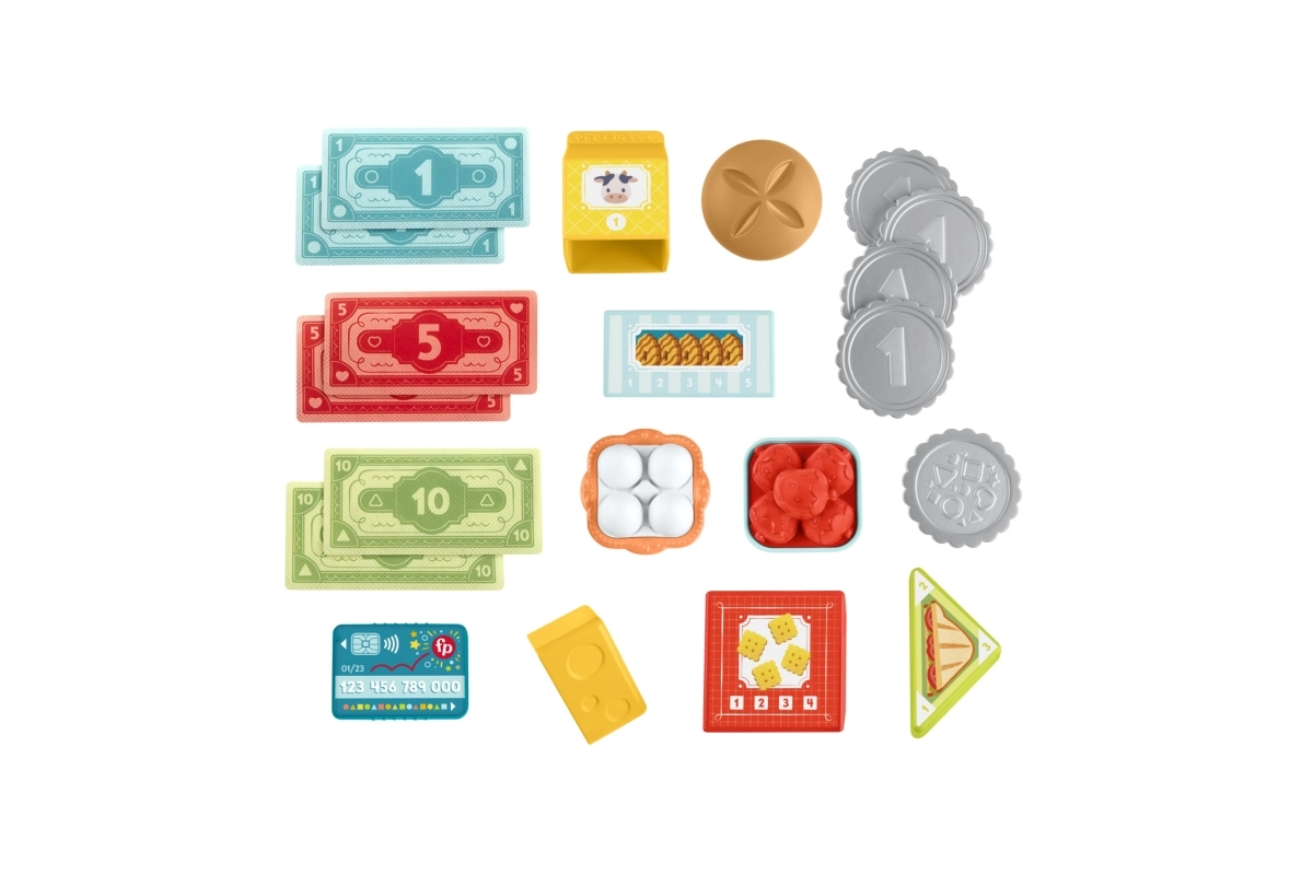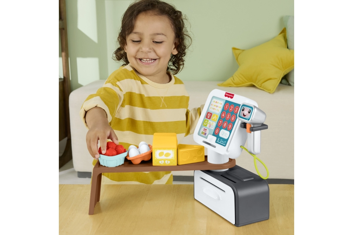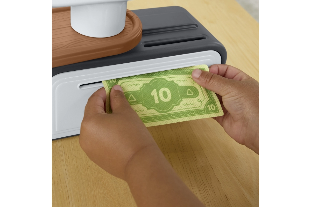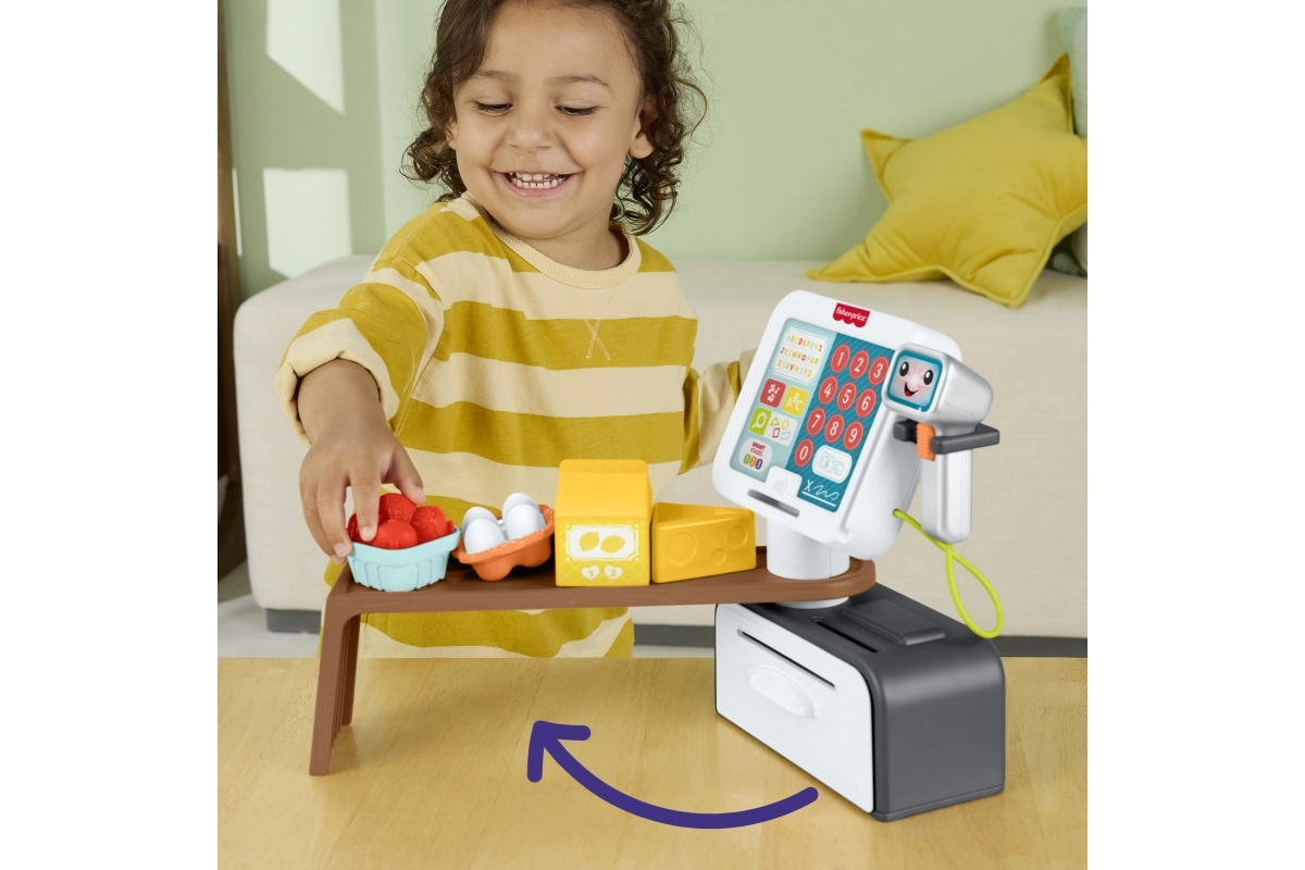 Kalbanti „Fisher‑Price“ kasa paverčia kiekvieną parduotuvės žaidimą smagiu mokymusi. Vaikai gali skenuoti produktus, spausti didelius spalvotus mygtukus, dėti banknotus ir monetas į stalčių ir mokėti kortele. Turtingas garso grįžtamasis ryšys su daugiau nei 150 garsų ir frazių skatina natūralų mokymąsi ir plečia žodyną.