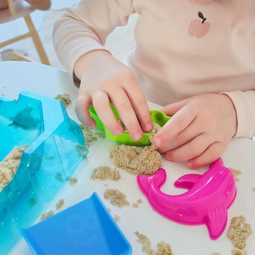 Kinetinis smėlis yra minkštas, malonus liesti, gerai laiko formą, nedžiūsta ir nelimpa prie rankų – idealus jutiminiam žaidimui vaikams nuo 3 metų.