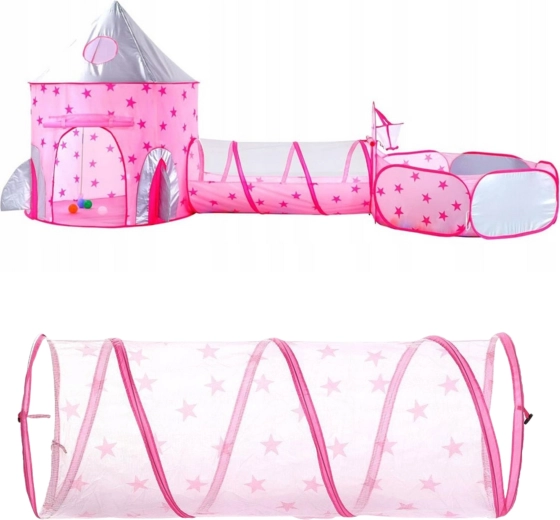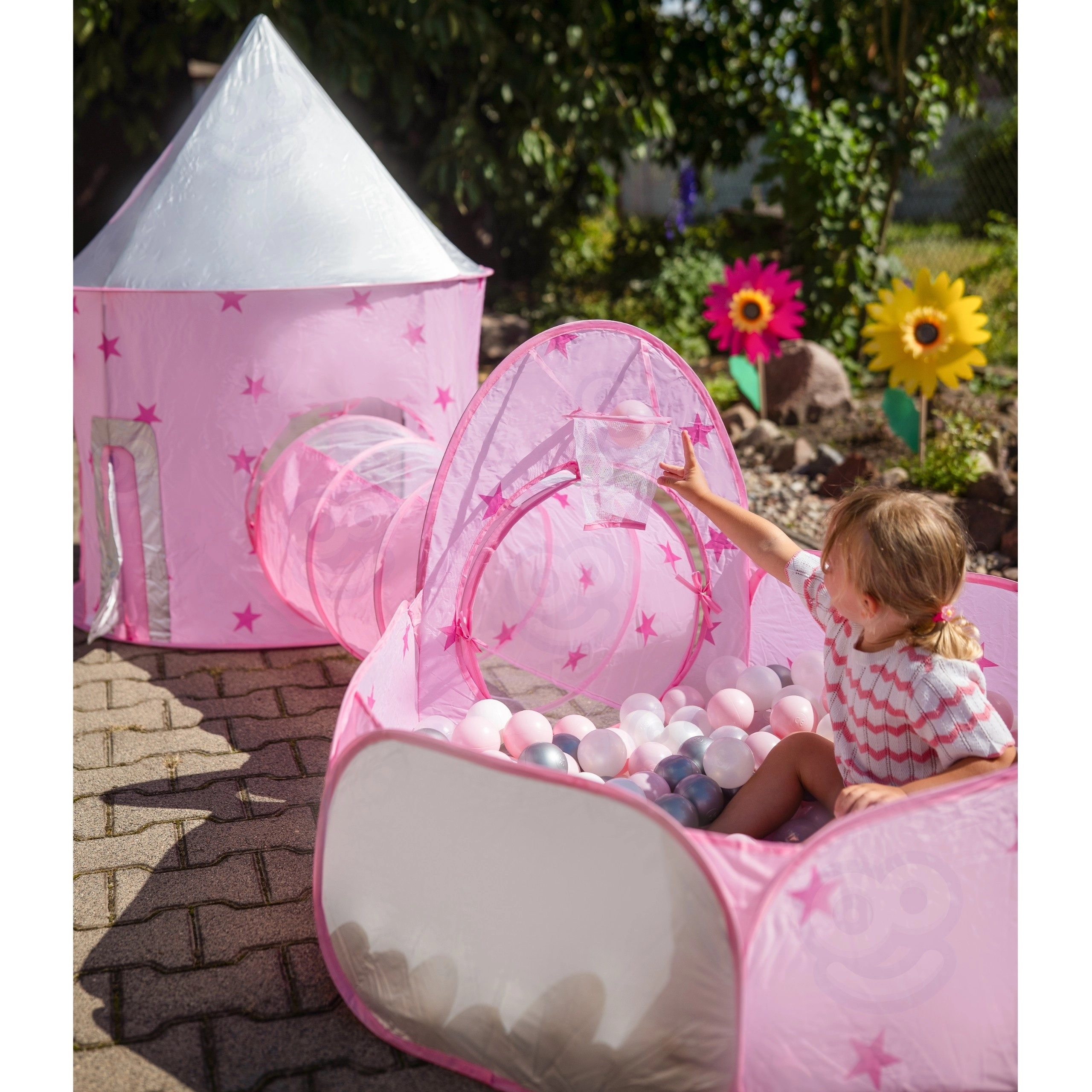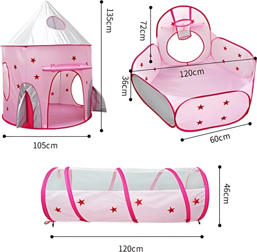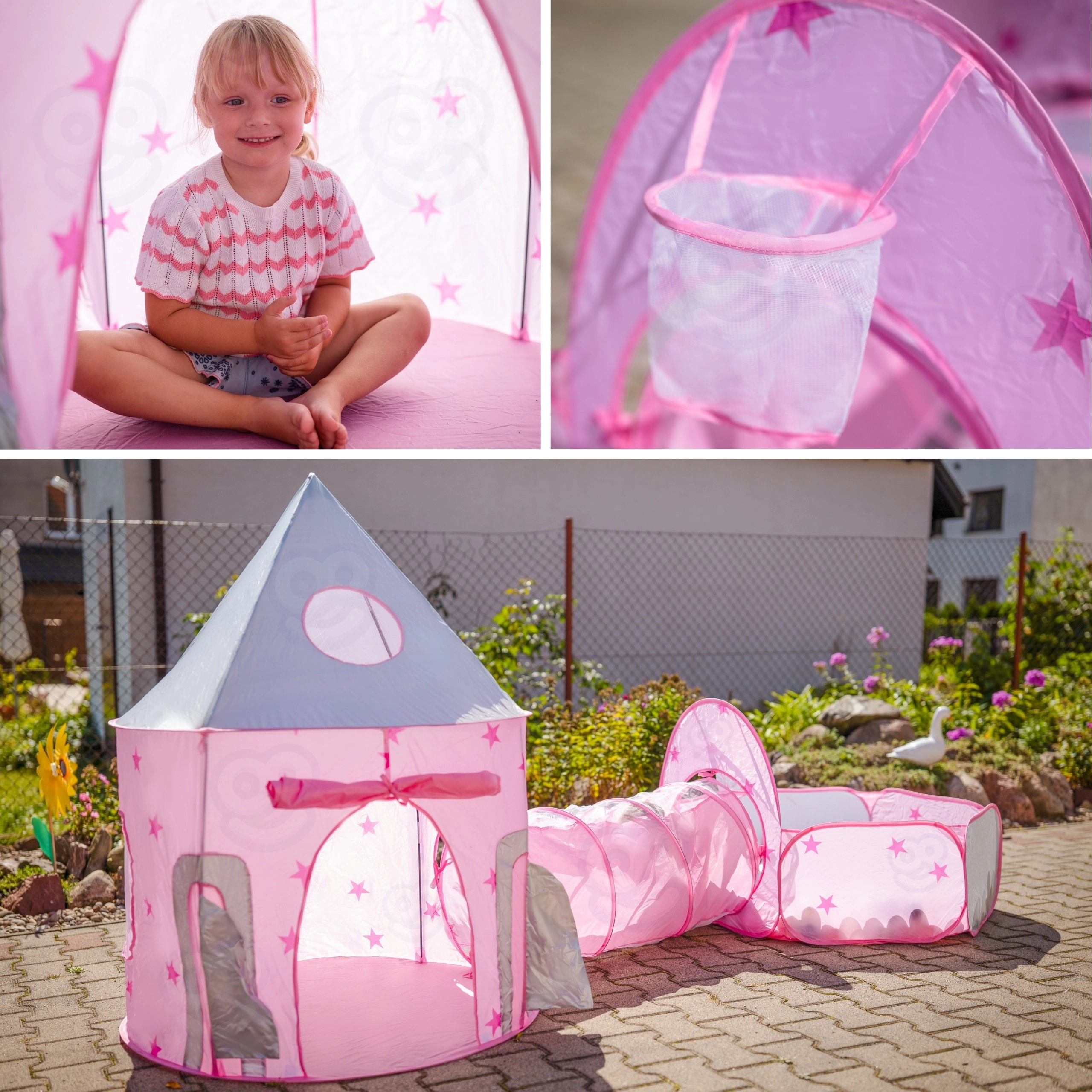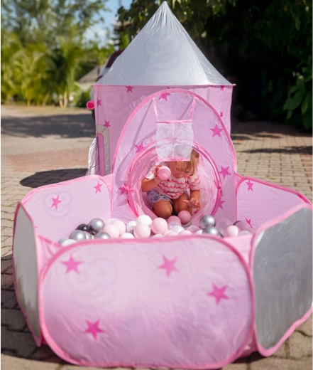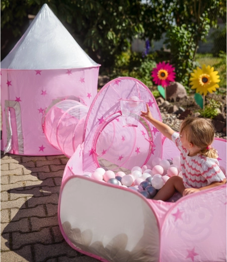 Rožinis 3 viename žaidimų rinkinys iš Woopie pavers kiekvieną kambarį ar sodą pasakiška karalyste. Jame yra pilies formos palapinė, jungiamasis tunelis ir erdvus sausas baseinėlis. Dėl pop-up konstrukcijos lengva išskleisti ir sulankstyti, idealiai tinka aktyviam žaidimui, fantazijos lavinimui ir bendram smagumui. Lengvas, sulankstomas, su tinkline ventiliacija ir puikiai tinka naudoti viduje ir lauke.