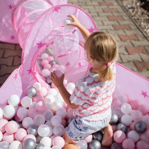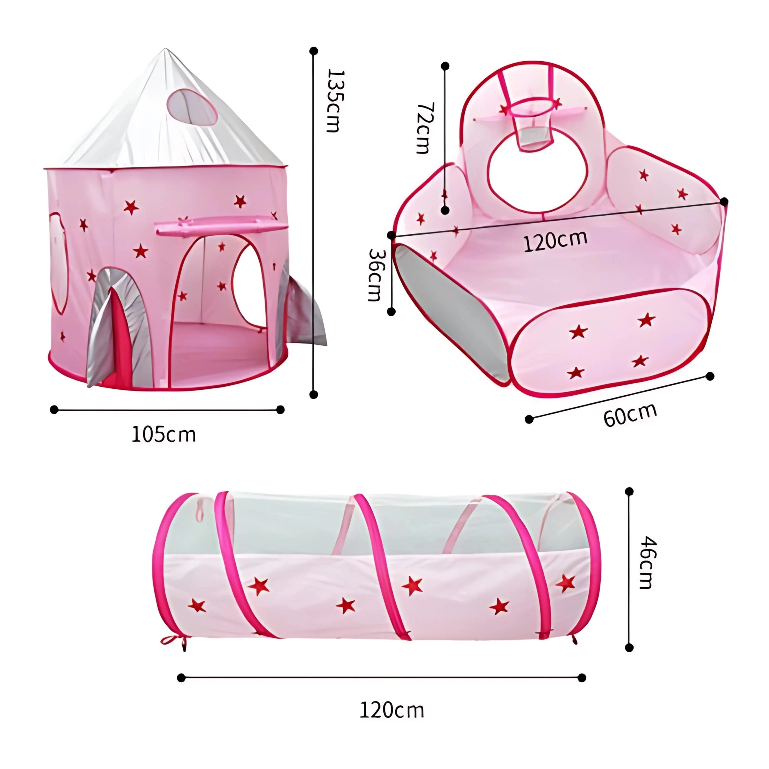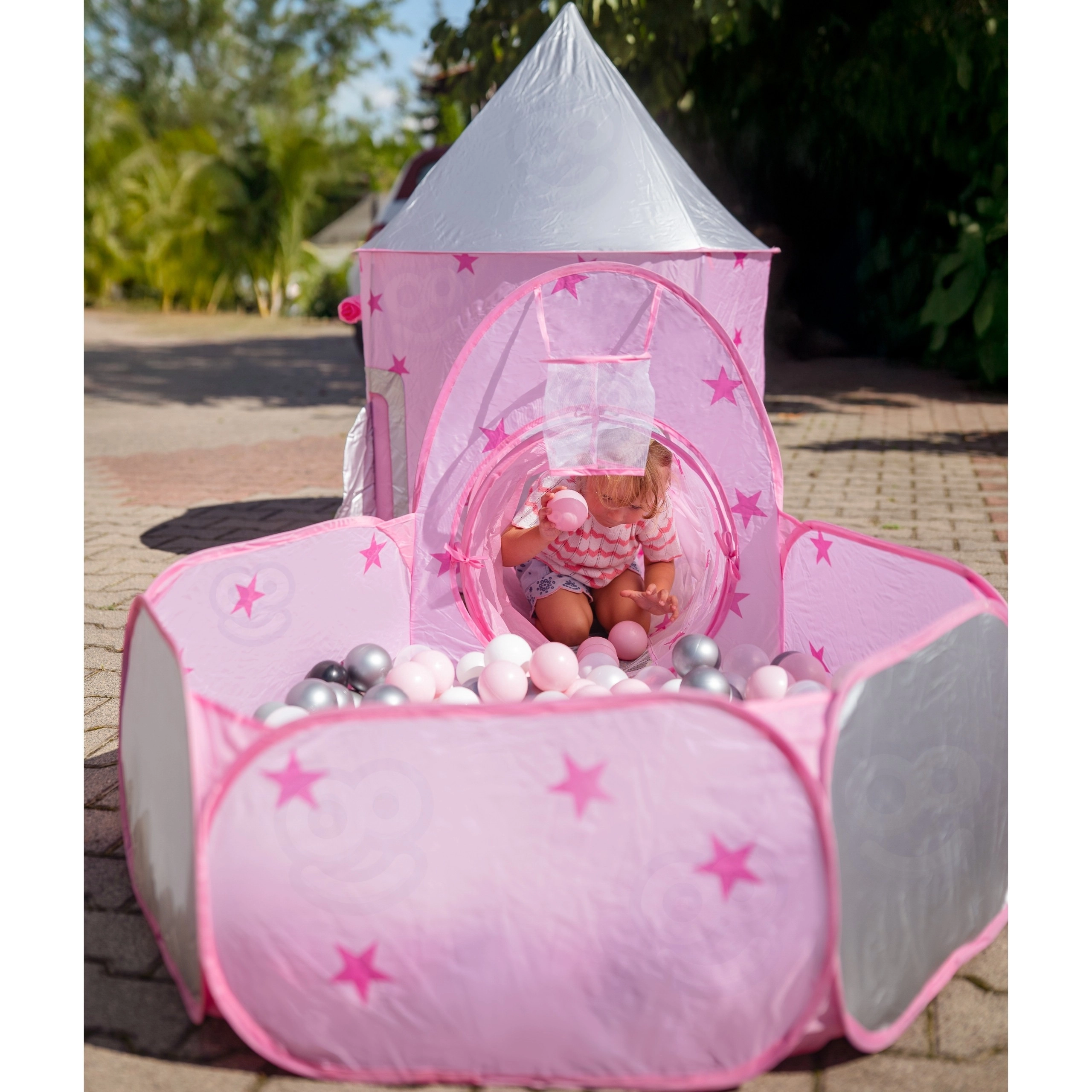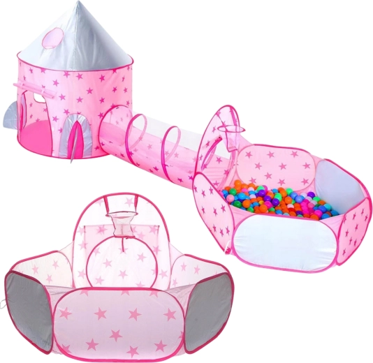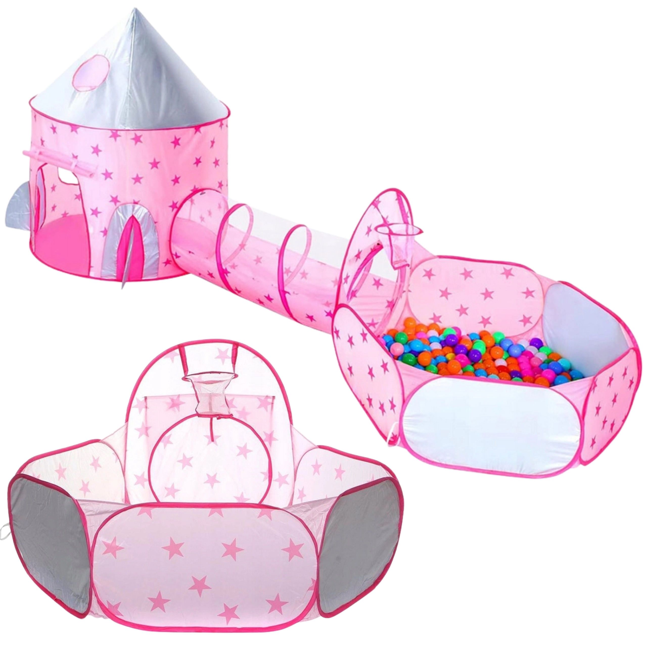 Rožinis 3 viename žaidimų rinkinys iš Woopie pavers kiekvieną kambarį ar sodą pasakiška karalyste. Jame yra pilies formos palapinė, jungiamasis tunelis ir erdvus sausas baseinėlis. Dėl pop-up konstrukcijos lengva išskleisti ir sulankstyti, idealiai tinka aktyviam žaidimui, fantazijos lavinimui ir bendram smagumui. Lengvas, sulankstomas, su tinkline ventiliacija ir puikiai tinka naudoti viduje ir lauke.