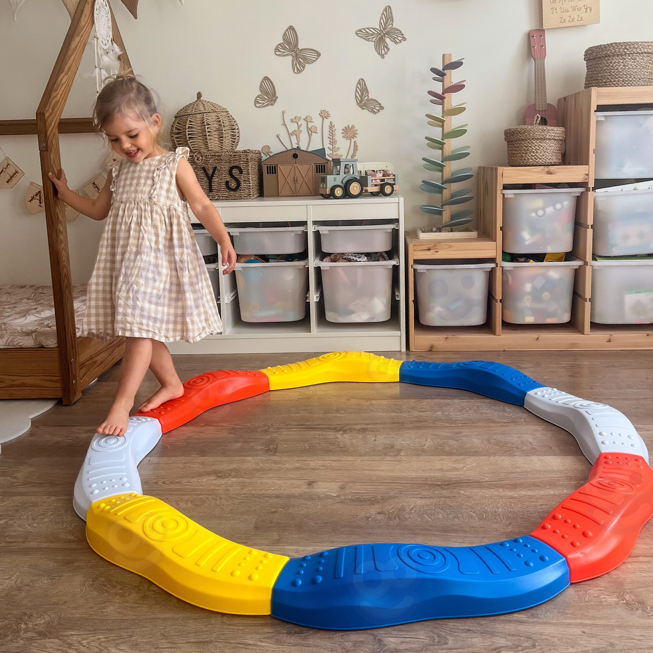 Modulinė Woopie trasa sukurta natūraliam vaikų nuo 3 metų vystymuisi. Faktūrinis paviršius su iškilimais ir įdubomis stimuliuoja pėdų receptorius, padeda palaikyti taisyklingą laikyseną ir stiprina stabilizuojančius raumenis. Spalvotos dalys iš patvaraus PP saugiai laikosi dėl neslystančių kojelių ir leidžia greitai keisti išdėstymą pagal vaikų fantaziją.