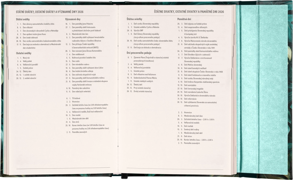 Jei ieškote efektyvaus būdo kontroliuoti savo planus, savaitinis dienoraštis Monstera 2026 yra idealus pasirinkimas. Dėl horizontalaus išdėstymo ir čekų bei slovakų kalendorių integracijos dienoraštis suteikia erdvės tiek asmeninėms, tiek darbo užduotims. Mėgaukitės praktiškomis mėnesio suvestinėmis, kurios puikiai tinka ilgesnių atostogų ar kelionių planavimui. Dienoraštyje taip pat yra čekų ir slovakų švenčių bei vardadienių sąrašas.