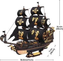Detalus karo laivo modelis su juodai auksinėmis burėmis ir gausiomis puošybos detalėmis. Kiekviena smulkmena kruopščiai apdirbta, kad išryškėtų ir suteiktų modeliui realistišką išvaizdą.